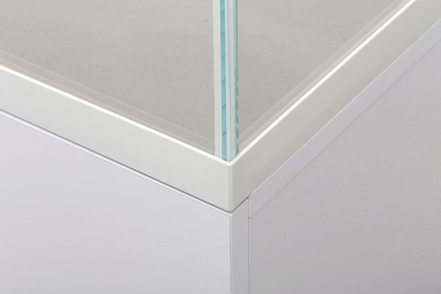Akvarij, izdelan iz belega stekla (optiwhite), poskrbi, da so v njem ustvarjene postavitve videti popolnoma barvno nevtralne in naravne. Polirani robovi in prozorno lepljenje zagotavljajo diskreten videz.