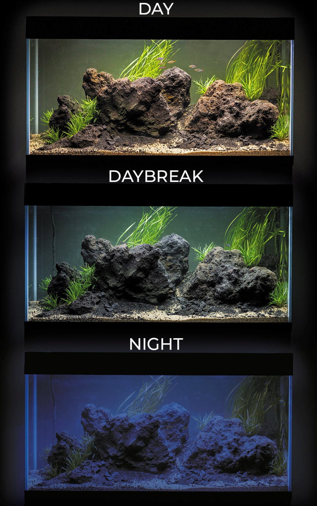 Akvarijska kombinacija Aquael OPTISET-125 je osvetljena z dvema 14-vatnima LED cevema Leddy LED Tubes Day & Night. Ti nista le zelo varčni, temveč imata tudi tri načine osvetlitve: dan / sončni vzhod / noč. Nastavitev je povsem enostavna prek stikala za luč. Še ena prednost: položaj osvetlitve je zaradi vodila brezstopenjsko nastavljiv in se lahko razširi na do največ 8/9 Leddy cevi (te niso vključene v obseg dobave).
