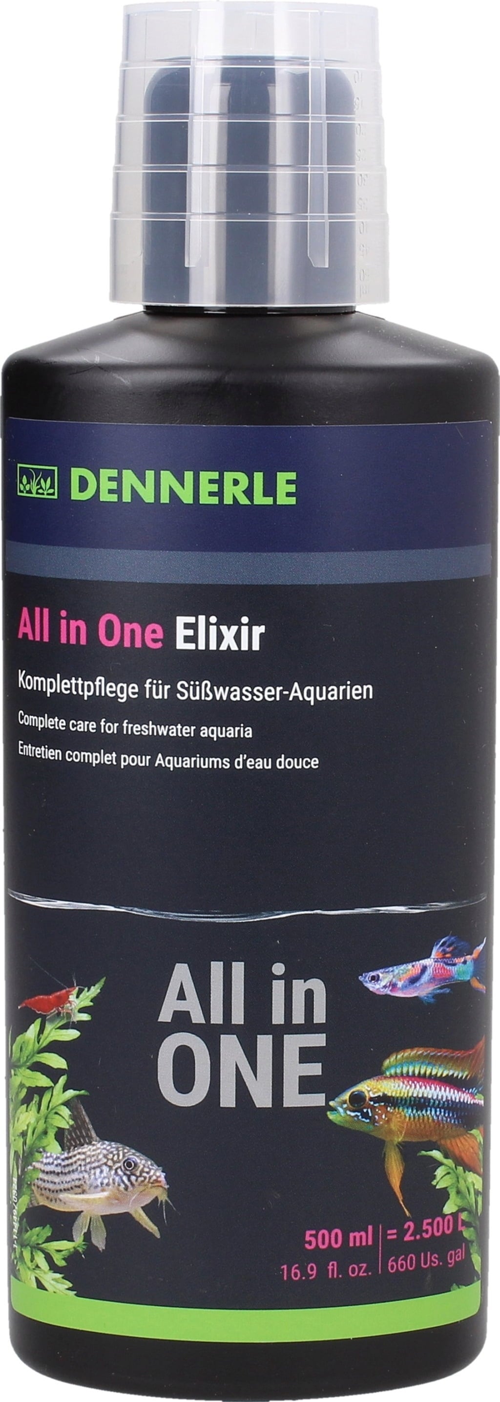 Vse v enem! Eliksir Dennerle akvariju zagotavlja 12 skrbno usklajenih aktivnih kompleksov: ogljik, železo, rastlinska hranila, stabilizatorji hranil, aminokisline, vitamini, elementi v sledeh, zeliščni izvlečki, aloe vera, dekspantenol, jod in ojačevalec filtrov! S tem je All-in-One! Eliksir omogoča lažje in pravočasno vzdrževanje akvarija. Uravnotežen akvarij z zdravimi ribami in nevretenčarji, veličastnimi rastlinami ter bistro in čisto vodo je preprosto zabaven.