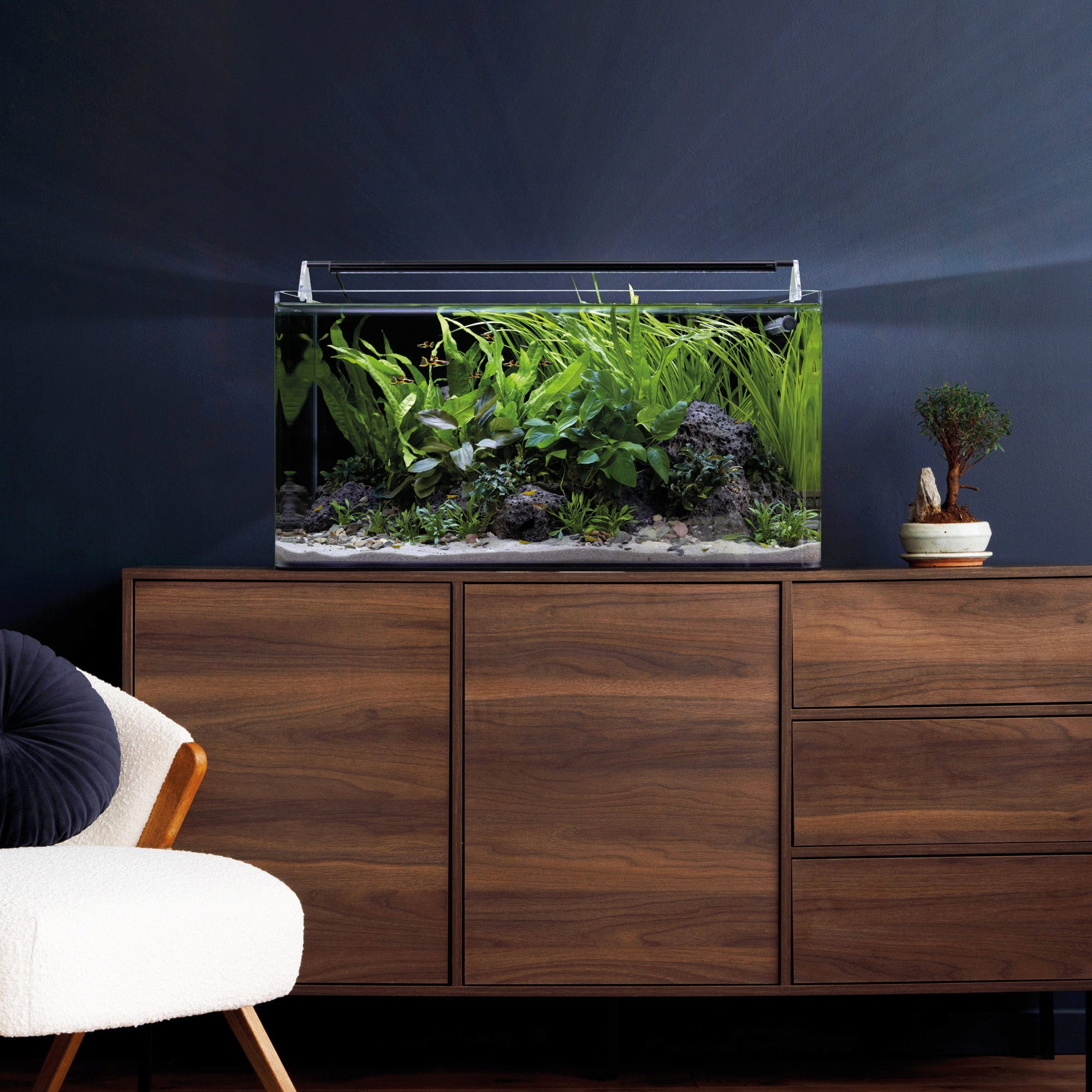 V paket vključena LED osvetlitev daytime onex iz elegantnega mat črnega aluminija ne le popolnoma poudari vaše rastline in prebivalce, temveč lahko s svojo visoko svetilnostjo tudi pospeši rast. Za kristalno čisto vodo poskrbi izjemno tih kotni filter Corner Filter, ki je tako kompakten, da skoraj ne zavzame prostora in je hkrati varen za vaše kozice.