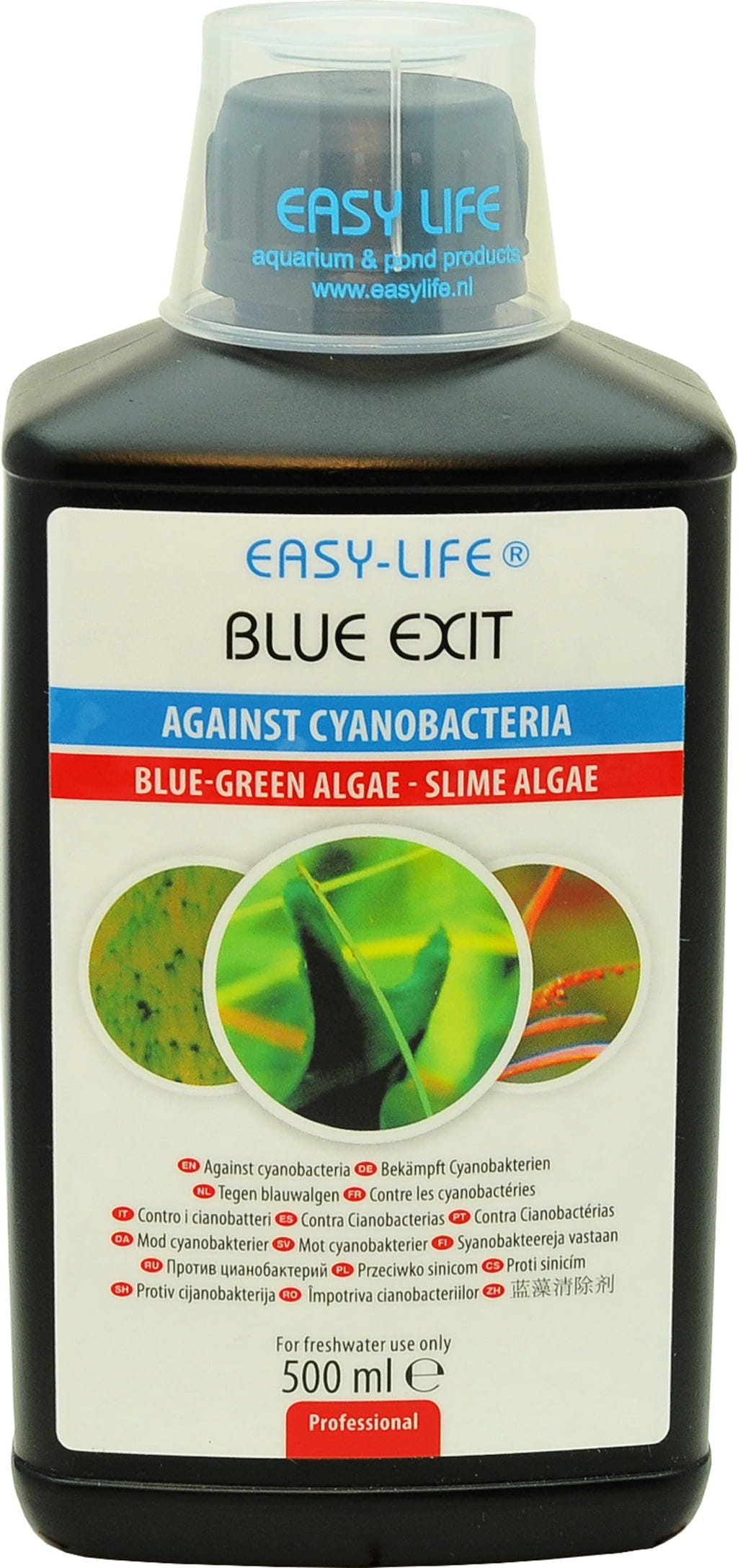 Easy-Life Blue Exit odstranjuje modrozelene alge (cianobakterije) brez uporabe antibiotikov ali spojin, ki vsebujejo baker, in tako ohranja vodo čisto.