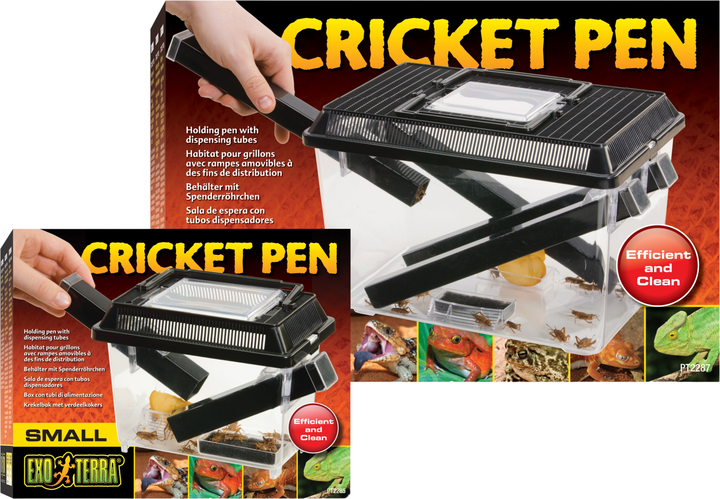 Sveže postreženi črički so med najbolj priljubljenimi poslasticami za terarske živali. Exo Terra Cricket Pen je izdelana iz plastike in je posoda za čričke, namenjena negi in vzgoji čričkov. Na obeh straneh posode so dolge črne cevi, v katere se črički še posebej radi umaknejo. Cevi niso povezane s pokrovom posode, tako da se pokrov lahko odstrani, ne da bi črički pobegnili. Črne cevke lahko vzamete iz zunanje strani posode in jih hkrati uporabite kot donorske cevke v terarijih. Posoda poleg hrane za čričke vsebuje tudi posodico za vodo. Pokrov je dobro zračen in omogoča zadosten dovod zraka.