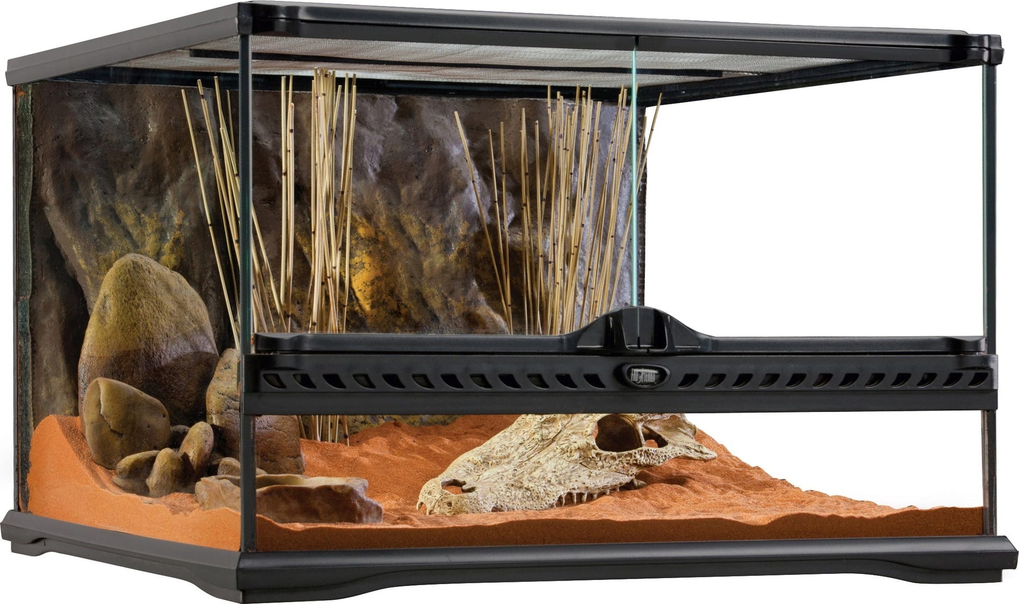 Robusten terarij iz polnega stekla je opremljen z realistično zadnjo steno iz kamna. Skalnato ozadje ne omogoča živalim, le da plezajo in se igrajo, ampak ustvarja tudi čudovite in naravne kulise, ki vam bodo vzele dih!