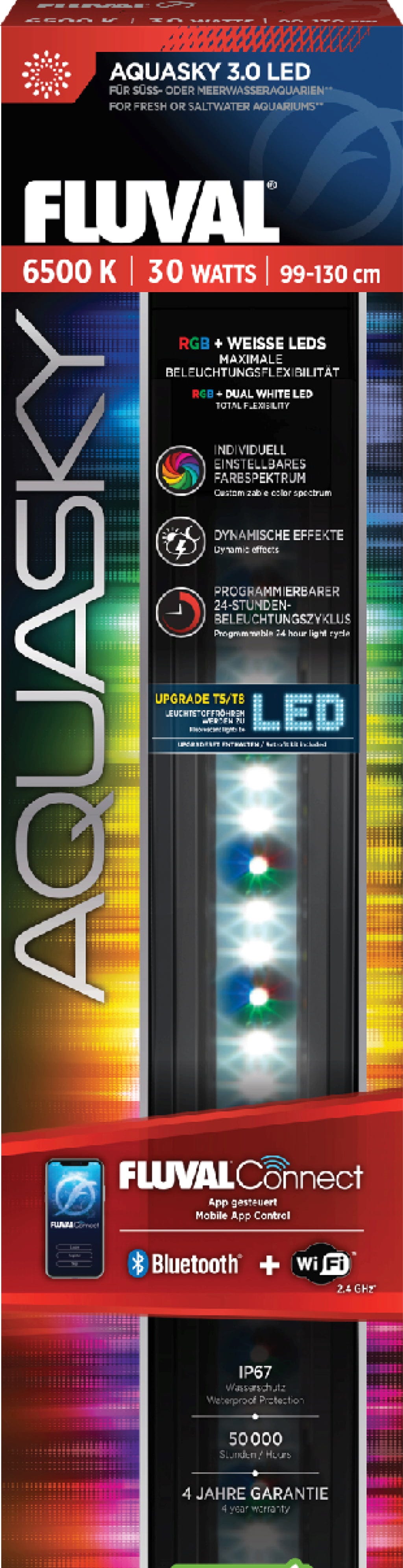 S svetilko Fluval AquaSky LED 3.0 boste svoj akvarij spremenili v dinamičen svetlobni spektakel, ki ga udobno upravljate prek pametnega telefona! Zahvaljujoč aplikaciji FluvalConnect ter novi povezavi WiFi in Bluetooth boste barvni spekter iz RGB in dodatnih belih LED-diod prilagodili popolnoma po svojem okusu.