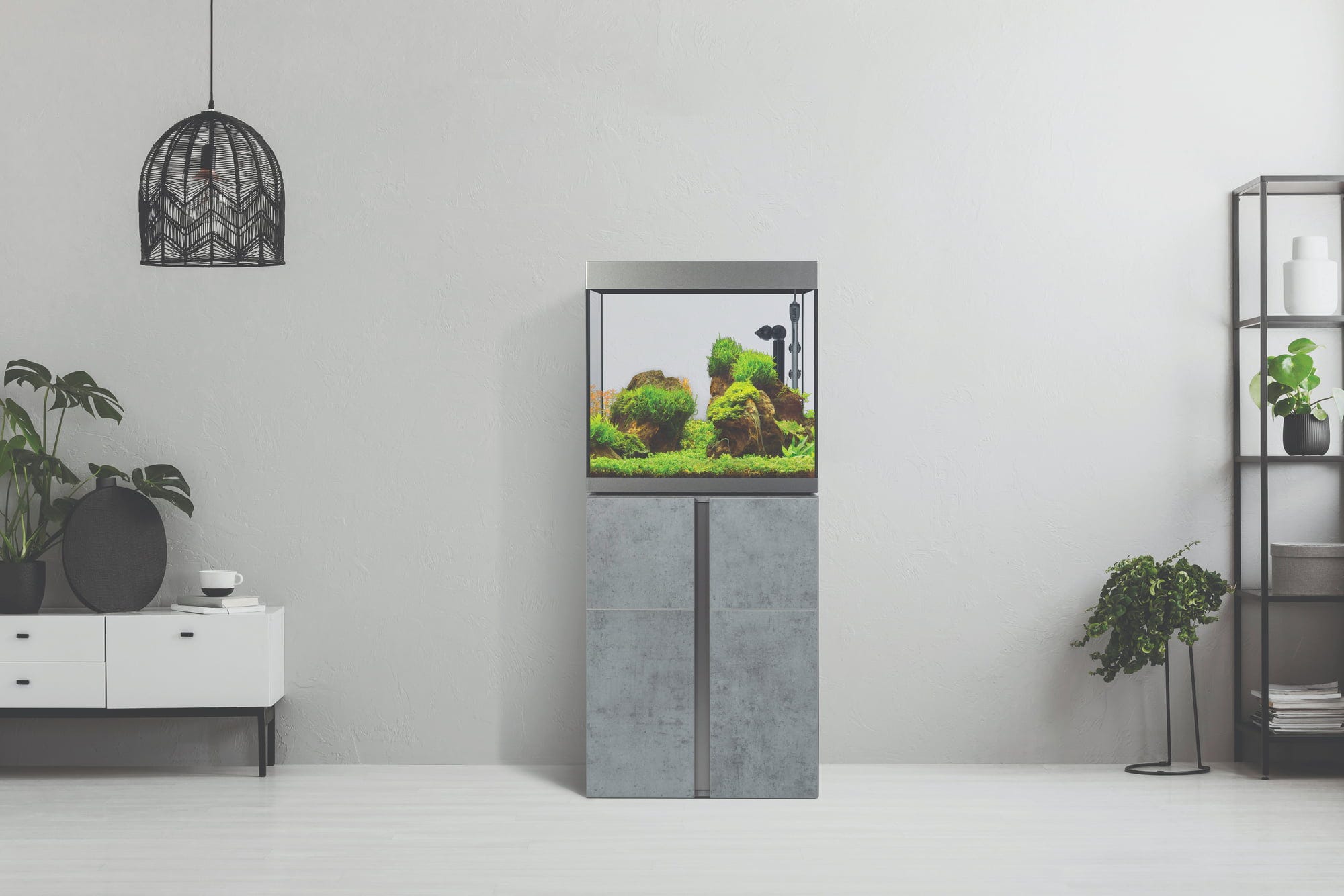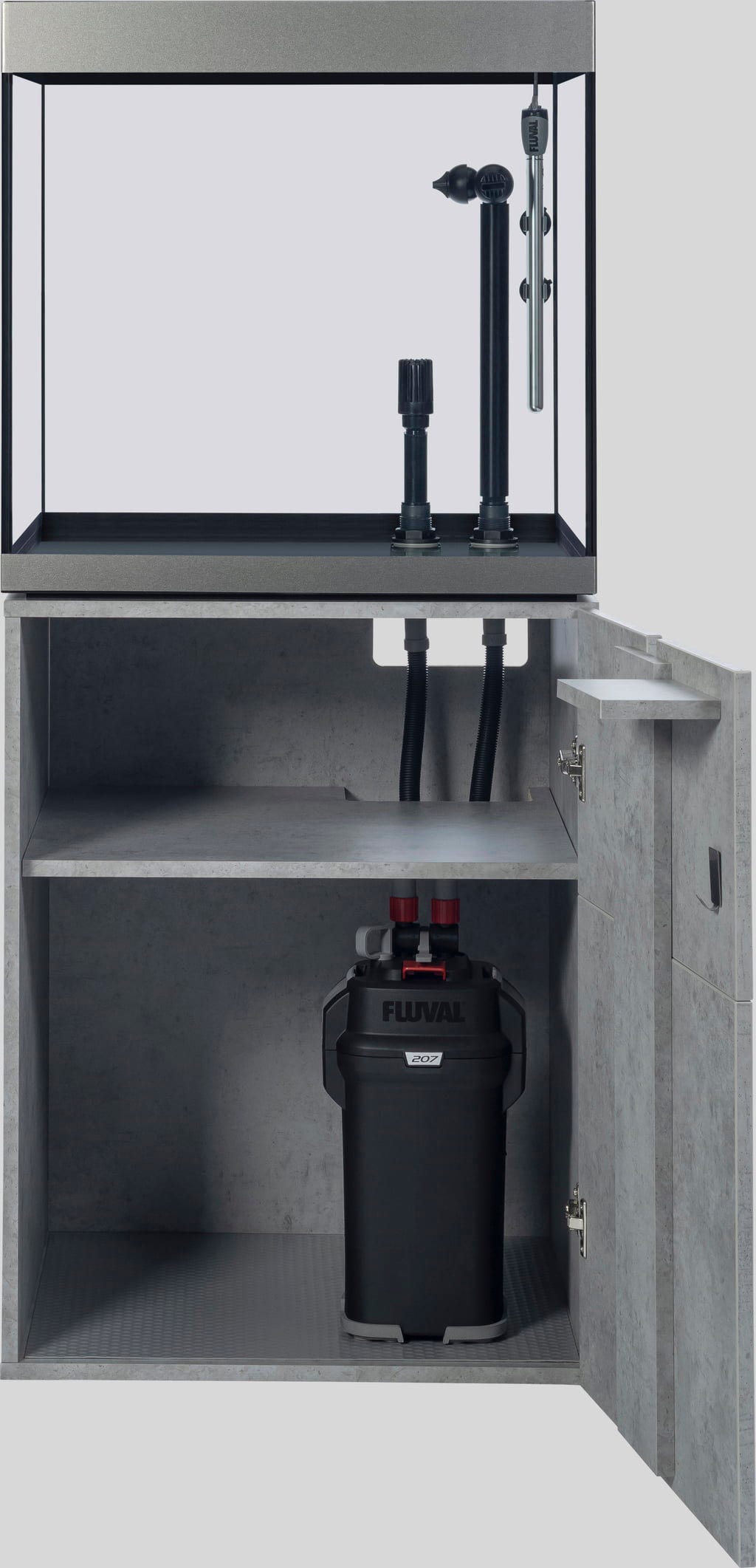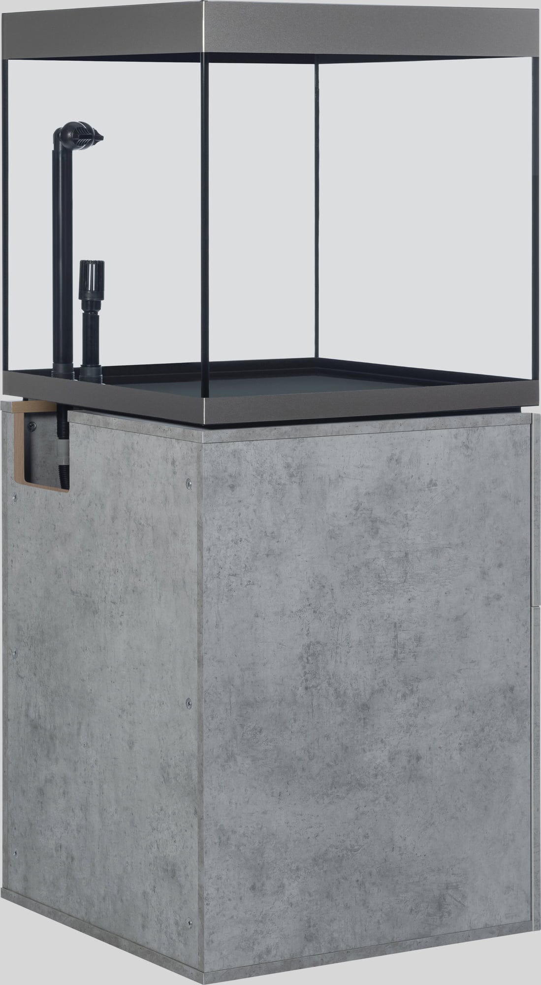 Urejene razmere v ozadju – notranjost omarice navdušuje s pregledno urejenostjo: ena stran omarice ima polico, ki na izjemno robustnih kovinskih nosilcih nudi varno oporo in prenese tudi težja bremena, kot so knjige ali jeklenke s CO2. Na nasprotni strani je na notranji strani vrat žična košara, v kateri so hrana in filtrirni mediji vedno pri roki. Vgrajen razdelilec z vtičnicami olajša nadzor nad kabli, ki ostanejo skriti za zaprtimi vrati. Tečaji Soft-Close omogočajo tiho odpiranje in zapiranje, višino šestih nog omarice pa je mogoče enostavno nastaviti iz notranjosti omarice. Dodatno odlagalno površino in kovinsko kljuko za lepljenje je mogoče namestiti glede na individualne potrebe.