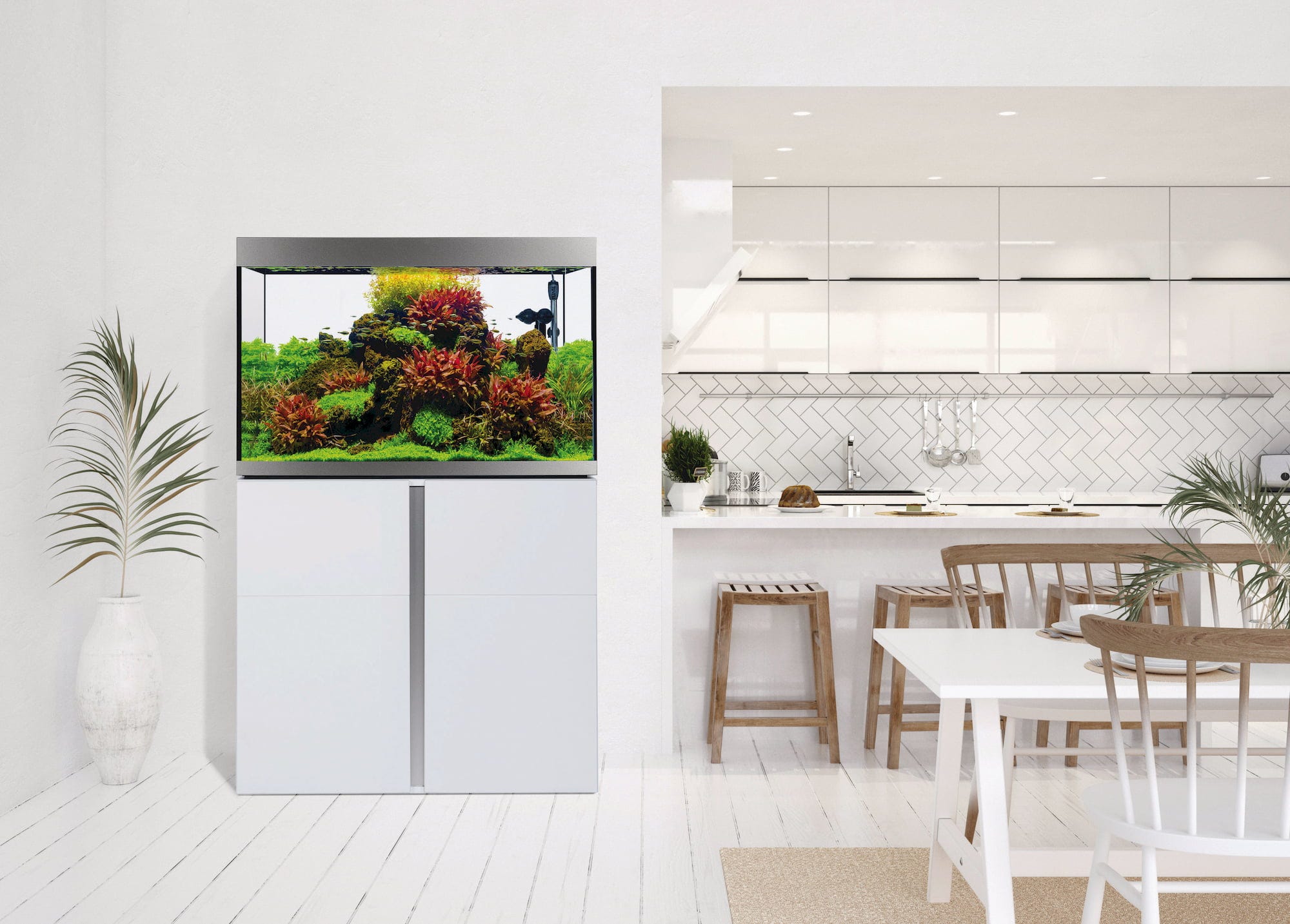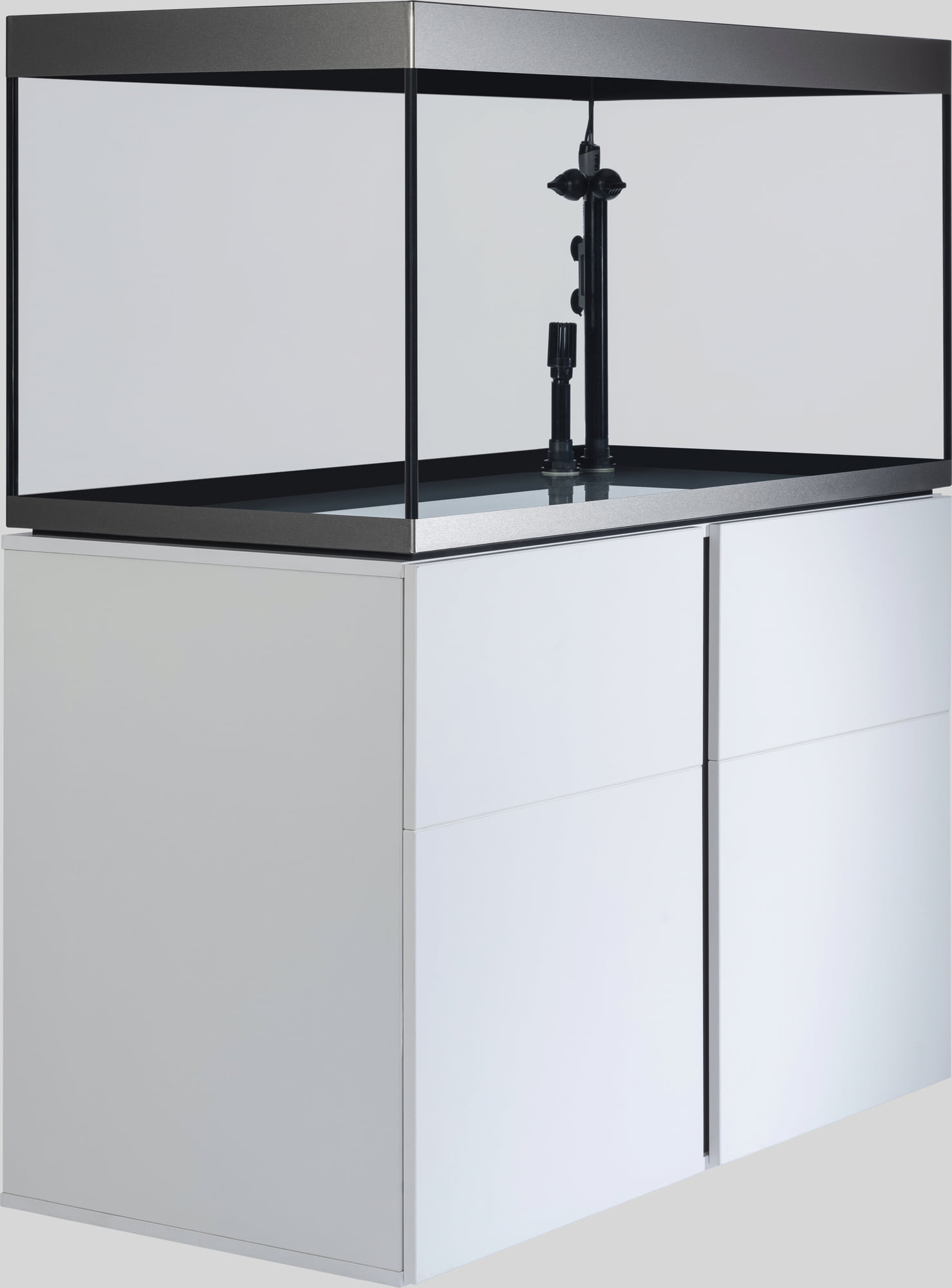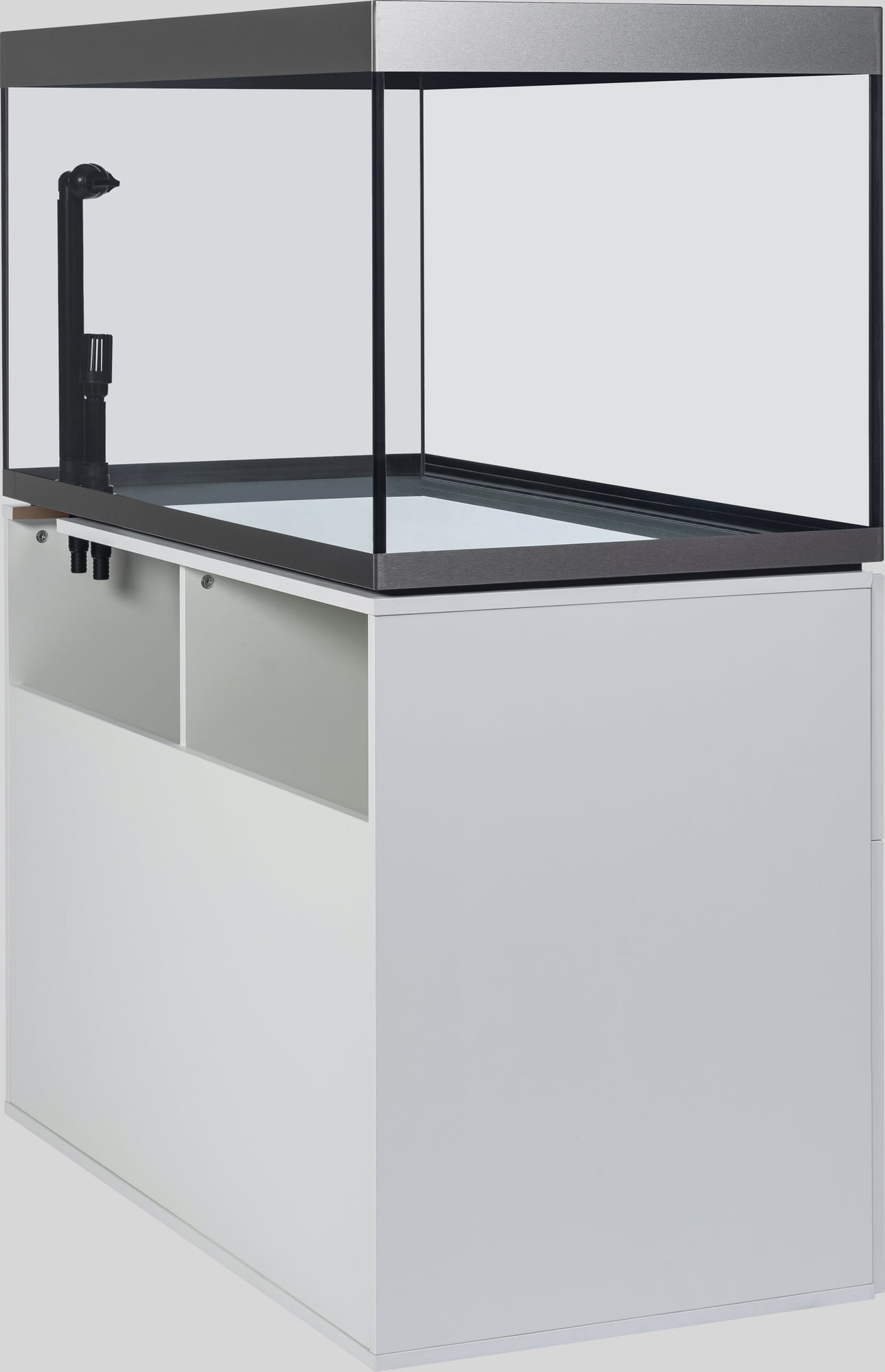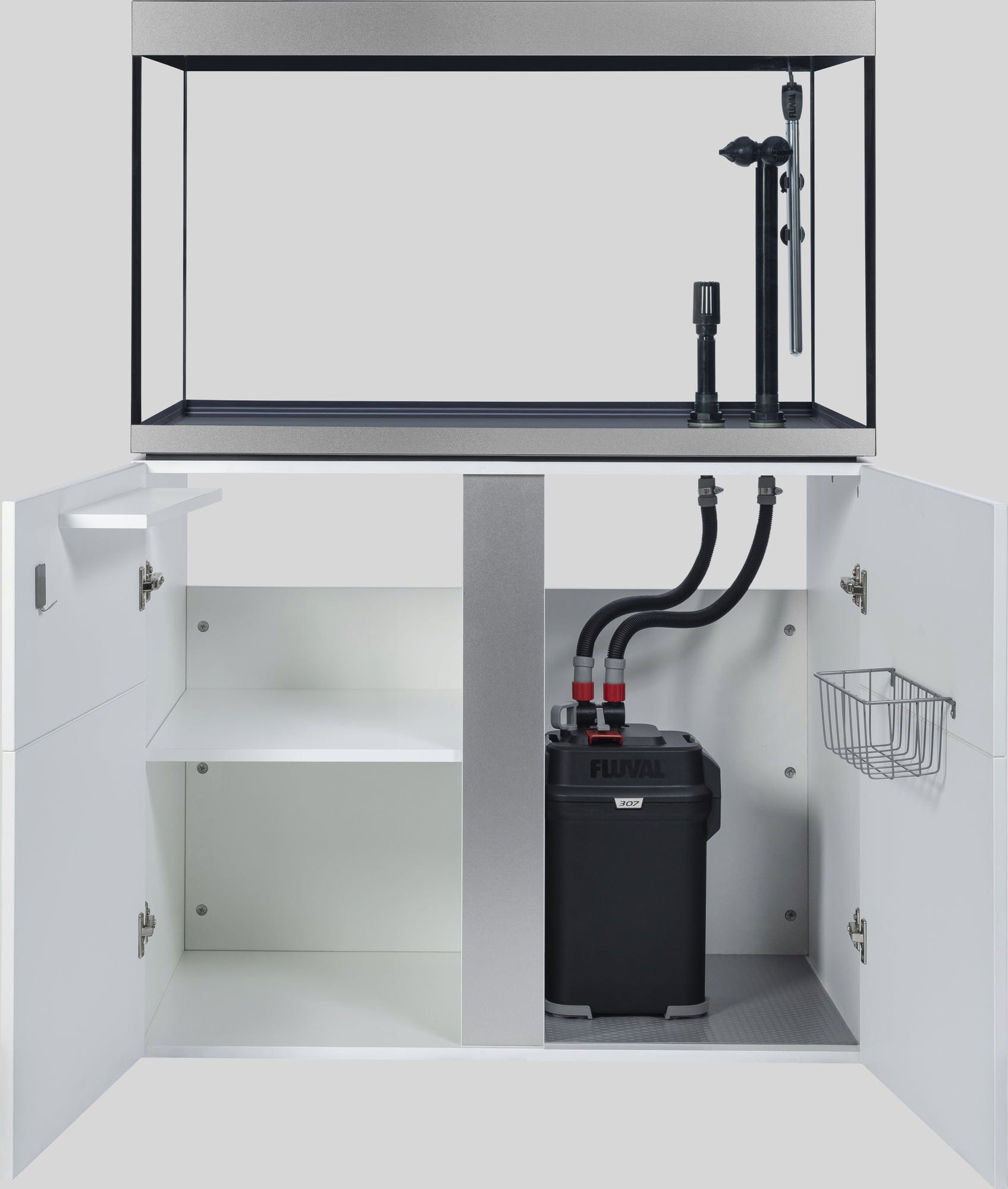 Urejene razmere v ozadju – notranjost omarice navdušuje s pregledno urejenostjo: ena stran omarice ima polico, ki na izjemno robustnih kovinskih nosilcih nudi varno oporo in prenese tudi težja bremena, kot so knjige ali jeklenke s CO2. Na nasprotni strani je na notranji strani vrat žična košara, v kateri so hrana in filtrirni mediji vedno pri roki. Vgrajen razdelilec z vtičnicami olajša nadzor nad kabli, ki ostanejo skriti za zaprtimi vrati. Tečaji Soft-Close omogočajo tiho odpiranje in zapiranje, višino šestih nog omarice pa je mogoče enostavno nastaviti iz notranjosti omarice. Dodatno odlagalno površino in kovinsko kljuko za lepljenje je mogoče namestiti glede na individualne potrebe.