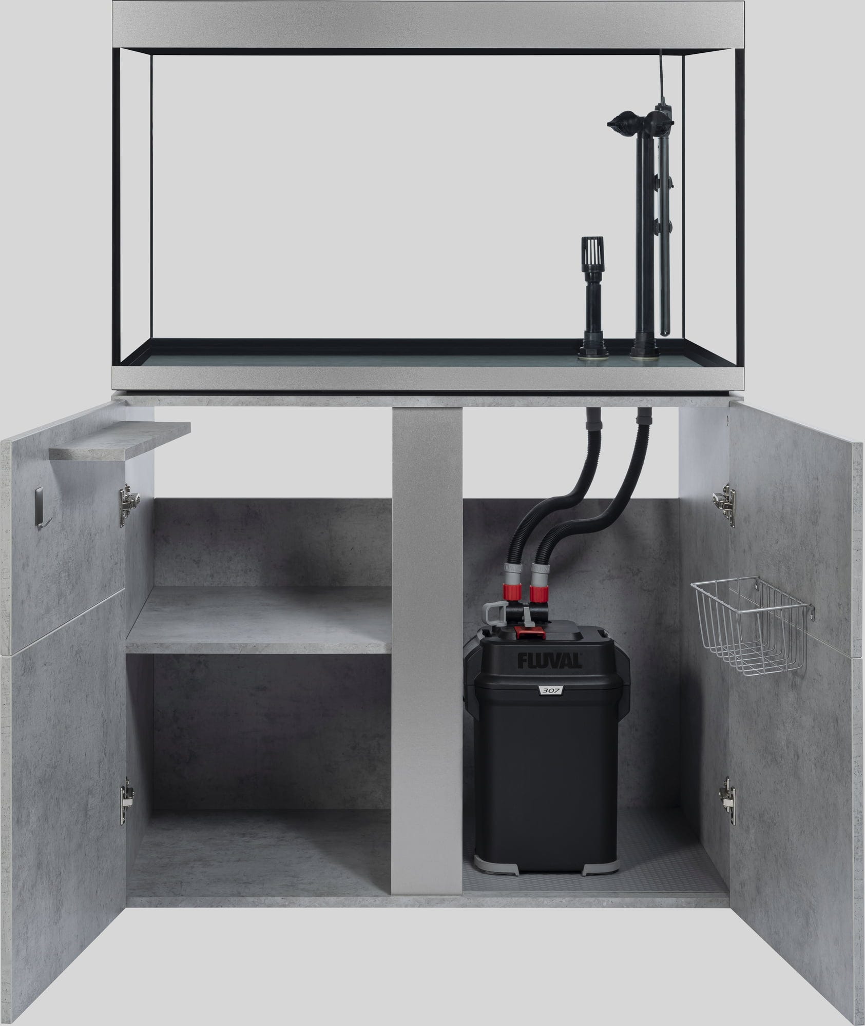 Urejene razmere v ozadju – notranjost omarice navdušuje s pregledno urejenostjo: ena stran omarice ima polico, ki na izjemno robustnih kovinskih nosilcih nudi varno oporo in prenese tudi težja bremena, kot so knjige ali jeklenke s CO2. Na nasprotni strani je na notranji strani vrat žična košara, v kateri so hrana in filtrirni mediji vedno pri roki. Vgrajen razdelilec z vtičnicami olajša nadzor nad kabli, ki ostanejo skriti za zaprtimi vrati. Tečaji Soft-Close omogočajo tiho odpiranje in zapiranje, višino šestih nog omarice pa je mogoče enostavno nastaviti iz notranjosti omarice. Dodatno odlagalno površino in kovinsko kljuko za lepljenje je mogoče namestiti glede na individualne potrebe.