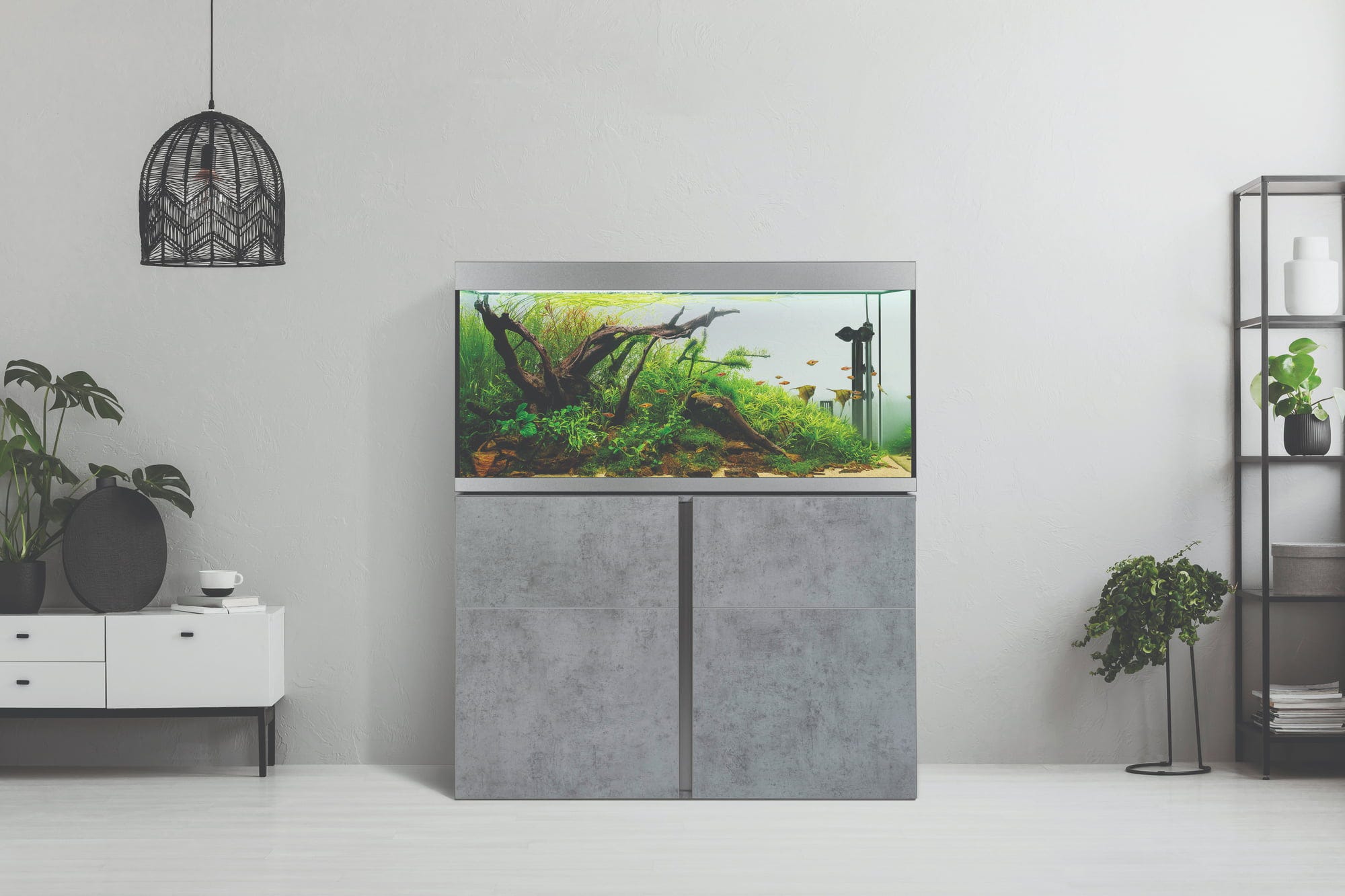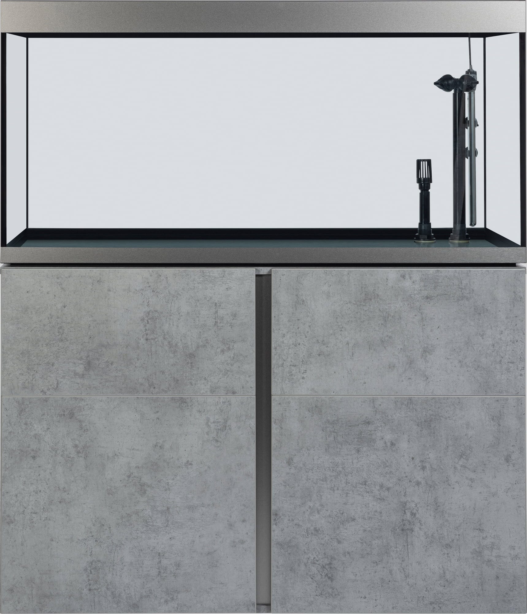 Urejene razmere v ozadju – notranjost omarice navdušuje s pregledno urejenostjo: ena stran omarice ima polico, ki na izjemno robustnih kovinskih nosilcih nudi varno oporo in prenese tudi težja bremena, kot so knjige ali jeklenke s CO2. Na nasprotni strani je na notranji strani vrat žična košara, v kateri so hrana in filtrirni mediji vedno pri roki. Vgrajen razdelilec z vtičnicami olajša nadzor nad kabli, ki ostanejo skriti za zaprtimi vrati. Tečaji Soft-Close omogočajo tiho odpiranje in zapiranje, višino šestih nog omarice pa je mogoče enostavno nastaviti iz notranjosti omarice. Dodatno odlagalno površino in kovinsko kljuko za lepljenje je mogoče namestiti glede na individualne potrebe.