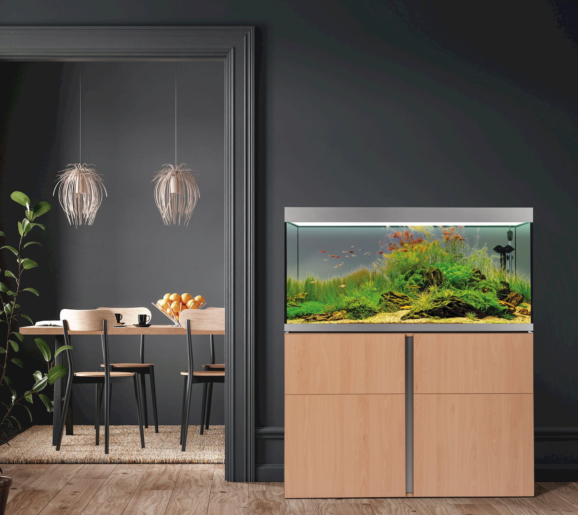 - Visokokakovostne okrasne letve 3M™ vzdolž akvarija ustvarjajo elegantne prehode do pokrova in spodnje omarice – akvarij daje vtis, kot da lebdi nad kosom pohištva
