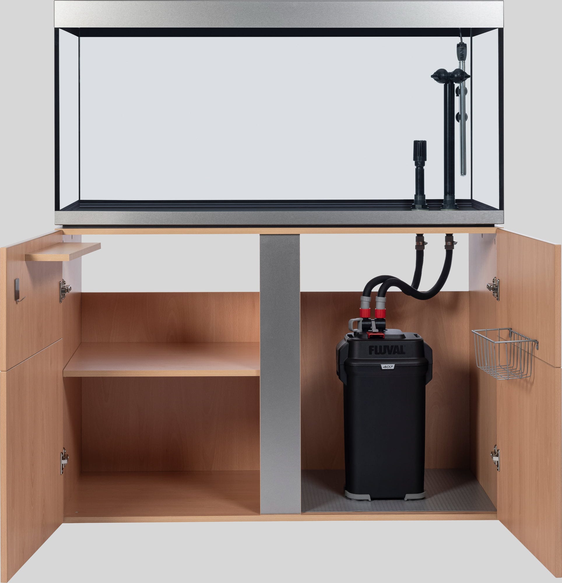 Urejene razmere v ozadju – notranjost omarice navdušuje s pregledno urejenostjo: ena stran omarice ima polico, ki na izjemno robustnih kovinskih nosilcih nudi varno oporo in prenese tudi težja bremena, kot so knjige ali jeklenke s CO2. Na nasprotni strani je na notranji strani vrat žična košara, v kateri so hrana in filtrirni mediji vedno pri roki. Vgrajen razdelilec z vtičnicami olajša nadzor nad kabli, ki ostanejo skriti za zaprtimi vrati. Tečaji Soft-Close omogočajo tiho odpiranje in zapiranje, višino šestih nog omarice pa je mogoče enostavno nastaviti iz notranjosti omarice. Dodatno odlagalno površino in kovinsko kljuko za lepljenje je mogoče namestiti glede na individualne potrebe.