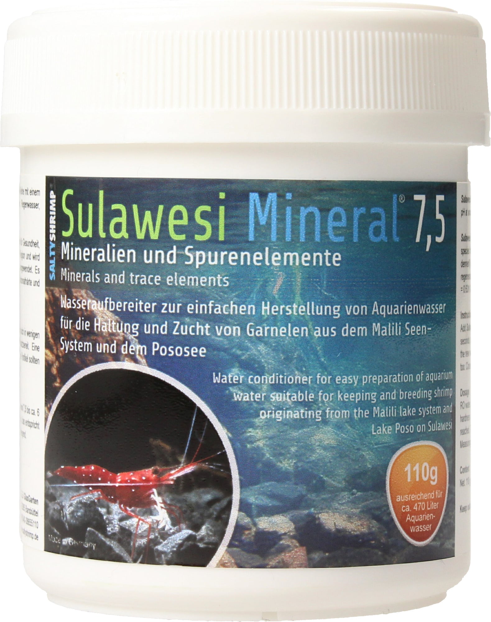 Proizvajalec SaltyShrimp je dal razviti mineralno sol SaltyShrimp Sulawesi Mineral 7.5 po izletu v jezerski sistem Malili na Sulaveziju na podlagi vzorcev vode, ki so jih prinesli s seboj. SaltyShrimp Sulawesi Mineral 7.5 je idealen za manj občutljive kozice Sulawesi, kot sta kardinalna kozica Caridina dennerli ali ghost cardinal kozica Caridina sp. S to posebej razvito mineralno soljo lahko popolnoma posnemate posebne vrednosti vode jezera Matano.
