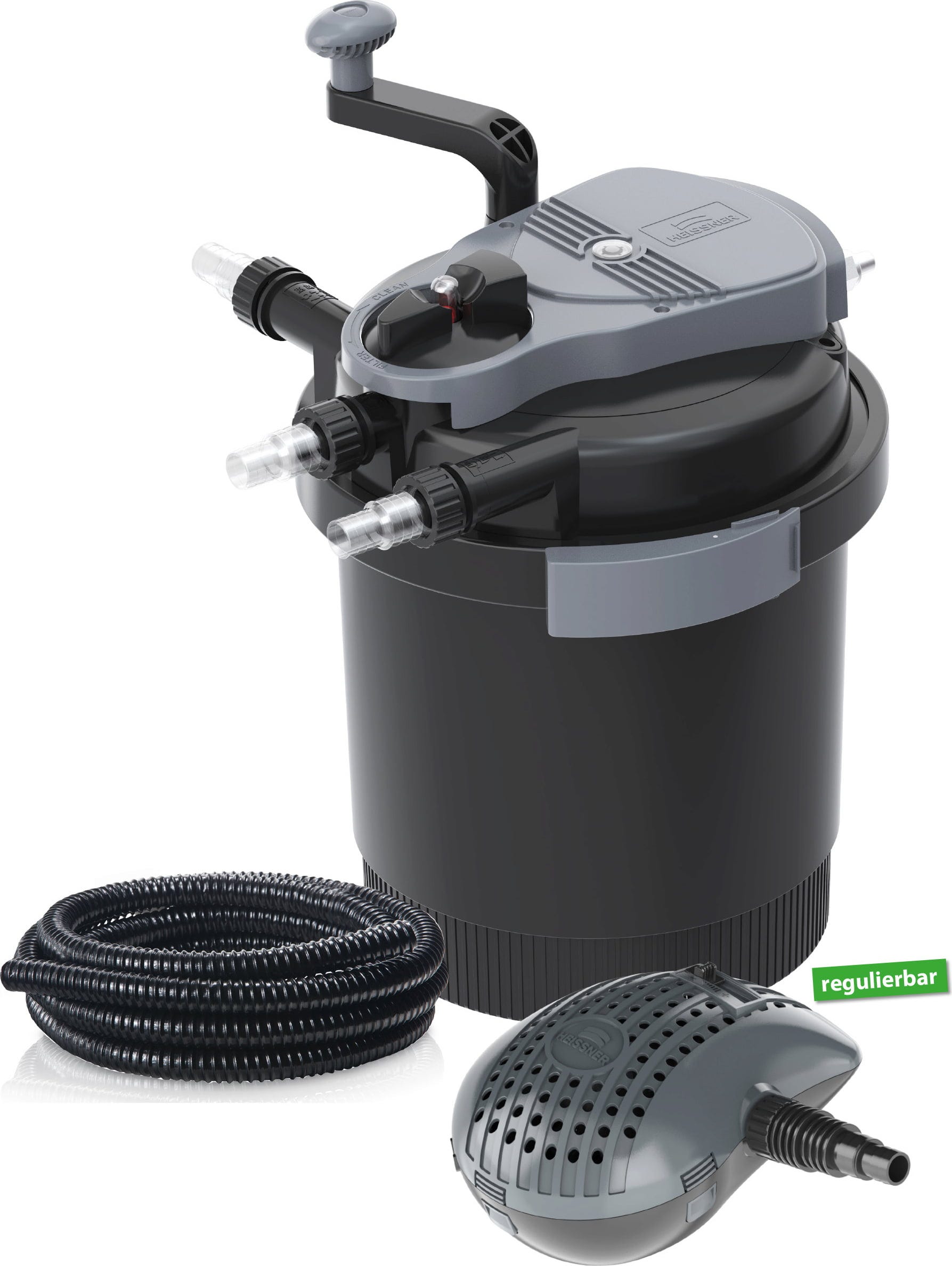 Filtrirni sistem za ribnik HEISSNER Aqua Craft Eco z nastavljivo filtrirno črpalko in integriranim UVC čistilnikom ponuja učinkovito rešitev za vaš ribnik. Zahvaljujoč sistemu povratnega izpiranja lahko filter očistite v nekaj sekundah, ne da bi morali odpreti ohišje. Sproščena umazanija se preprosto izpusti skozi ločen iztok. Očiščeno vodo lahko nato enostavno prečrpate v višje gladine potokov ali fontan ali pa jo uporabite za okrasne vodne elemente.