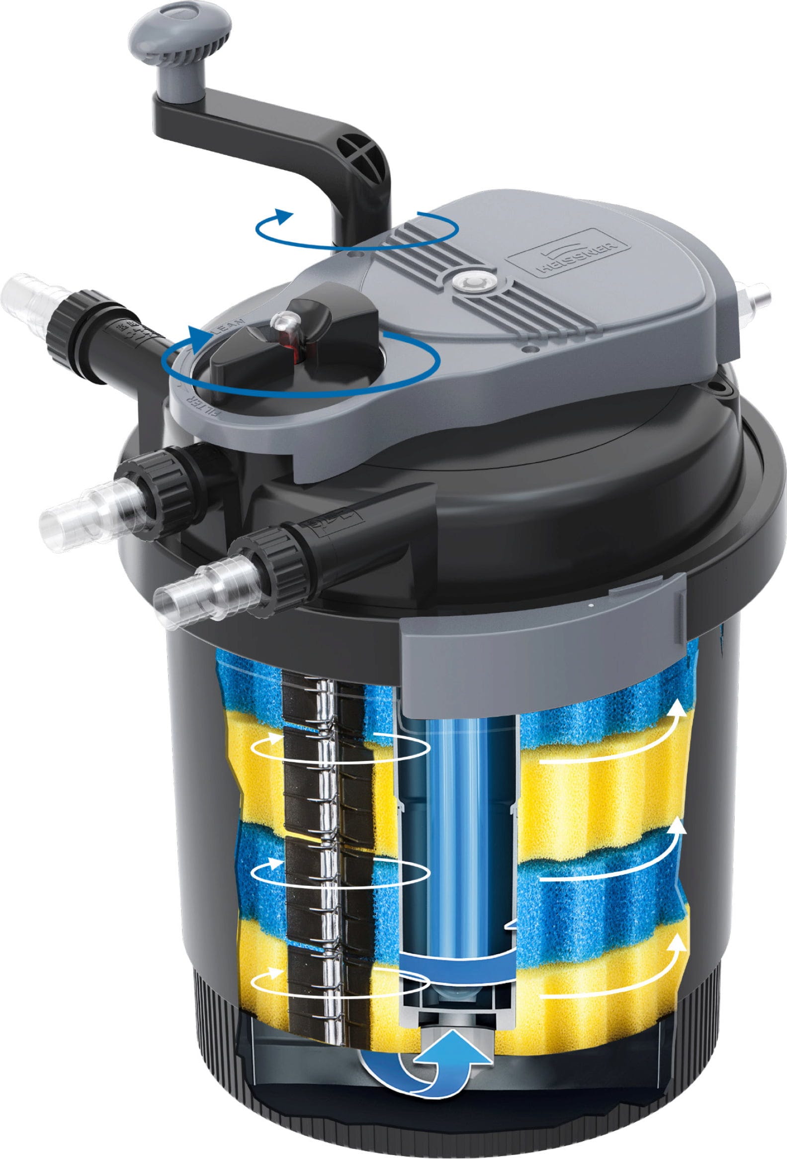 - Tlačni filter z UVC-čistilnikom (7 W) in funkcijo povratnega izpiranja