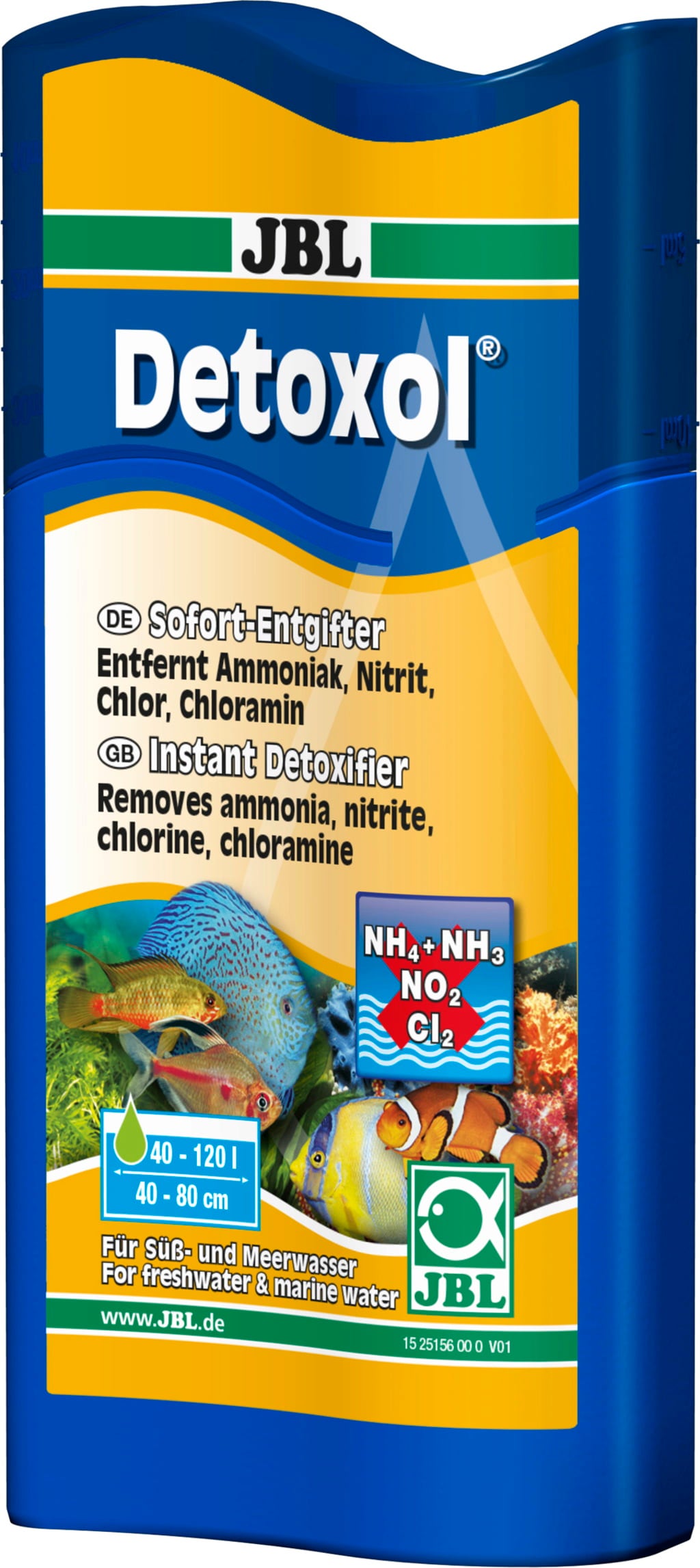 JBL Detoxol je takojšnji razstrupljevalec za zdrave sladkovodne in morske akvarije, za katerega se je izkazalo, da lahko nevtralizira toksine v 10 minutah. Snovi kot so amoniak (NH3), nitrit (NO2), klor in kloramin imajo lahko smrtonosen učinek na občutljive akvarijske ribe. Z dodatkom JBL Detoxol se toksini varno in hitro nevtralizirajo v 10 minutah in ne predstavljajo več tveganja. Poleg tega je treba poiskati in odpraviti tudi vzroke za nastanek toksinov.