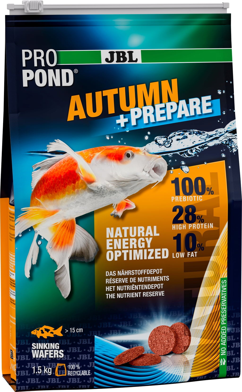 ProPond Autumn + Prepare znamke JBL je popolna hrana brez barvil in konzervansov, ki je primerna za vse ribe v ribniku, vključno s koi, zlatimi ribicami in pajčolankami. Toneče granule v obliki vafljev so idealne za jesen - ribe jih zlahka absorbirajo in pomagajo ustvariti zaloge za zimske mesece, ko primanjkuje energije.