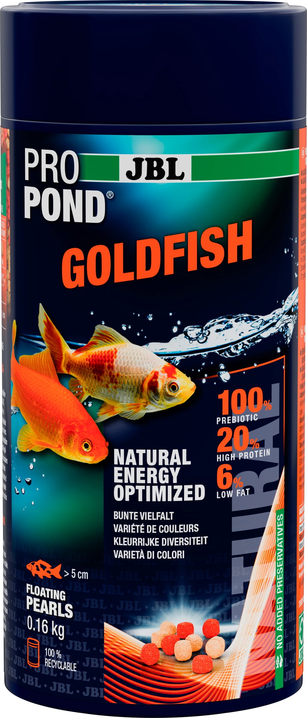 ProPond Goldfish znamke JBL je popolna plavajoča krmna mešanica, ki je idealna za zlate ribice in druge ribe v ribniku ter se lahko hrani vse leto. Vsebuje pšenico, lososa, kozice in špinačo ter lahko podpira barvitost vaših zlatih ribic!