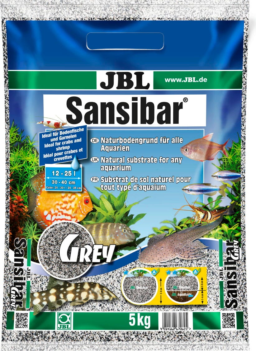 JBL Sansibar Grey je neobarvana naravna podlaga z zrnato, zaobljeno mivko, primerna za vse akvarije in optimalna za živali, ki rijejo po dnu, saj se ta fin zaobljen kremenčev pesek nahaja tudi v njihovih domačih vodah. Pri ribah, ki rijejo po dnu, kot so skati, činklje in somi, se ohranijo občutljive brke. Fina granulacija in gosta struktura preprečujeta pronicanje mulja in drugih odpadkov ter tako preprečujeta procese gnitja, ki bi lahko ovirali rast rastlin. Za bujno rast rastlin priporočamo dolgotrajno hranilno podlago JBL AquaBasic plus z JBL Sansibar Grey kot vrhnjo plastjo. JBL Sansibar Grey v akvarijsko vodo ne oddaja niti snovi, ki povzročajo trdoto, niti neželenih silikatov.
