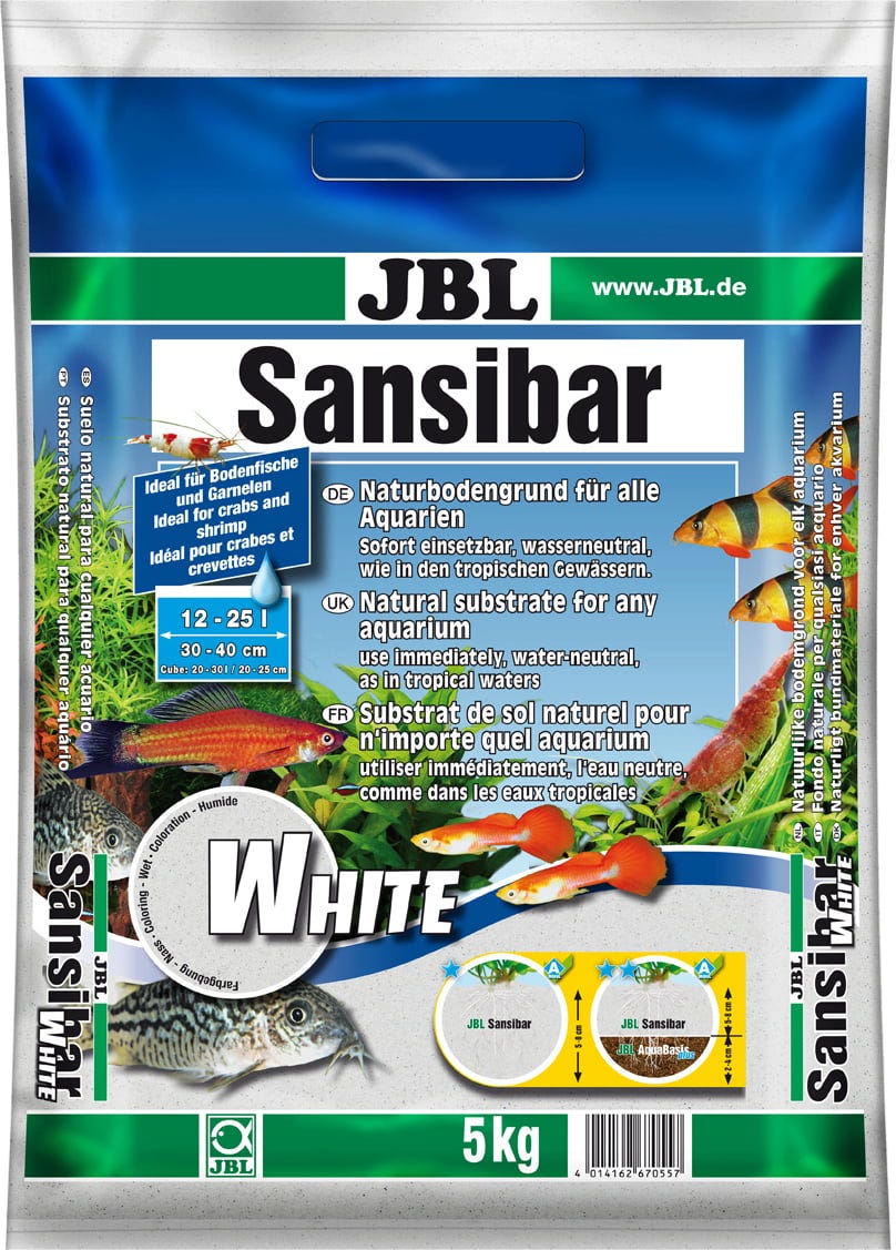 JBL Sansibar White je naravna podlaga za vse akvarije in optimalna za živali, ki rijejo po dnu, saj se ta fin zaobljen kremenčev pesek nahaja tudi v njihovih domačih vodah. Pri ribah, ki rijejo po dnu, kot so oklepni somiči in činklje, se ohranijo občutljive brke. Fina granulacija in gosta struktura preprečujeta pronicanje mulja in drugih odpadkov ter tako preprečujeta procese gnitja, ki bi lahko ovirali rast rastlin. Za bujno rast rastlin priporočamo dolgotrajno hranilno podlago JBL AquaBasic plus z JBL Sansibar White kot vrhnjo plastjo. JBL Sansibar White v akvarijsko vodo ne oddaja niti snovi, ki povzročajo trdoto, niti neželenih silikatov.