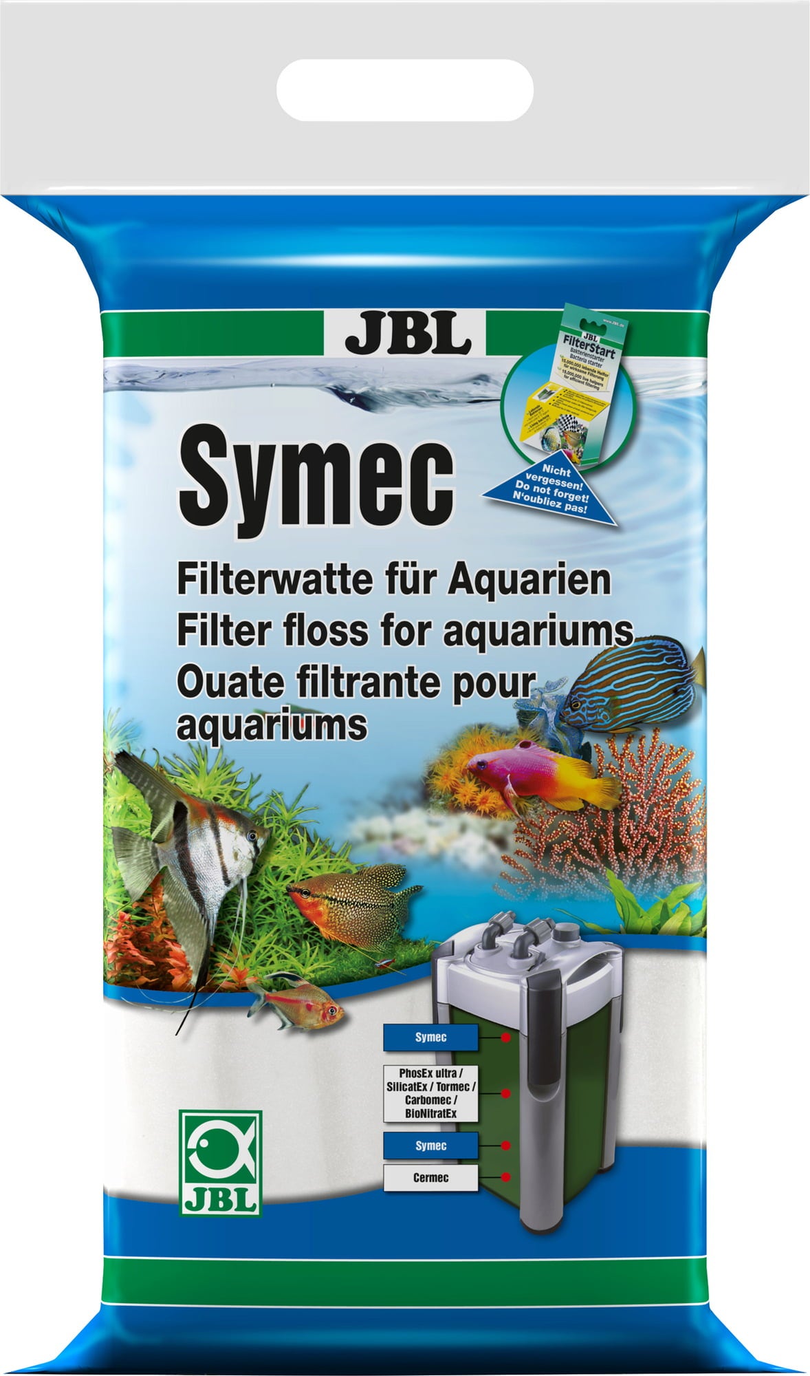 Ker je filtrirna nitka JBL Symec sestavljena iz vodonevtralnih, popolnoma sintetičnih vlaken, se v akvarijski vodi ne sproščajo nobena onesnaževala.