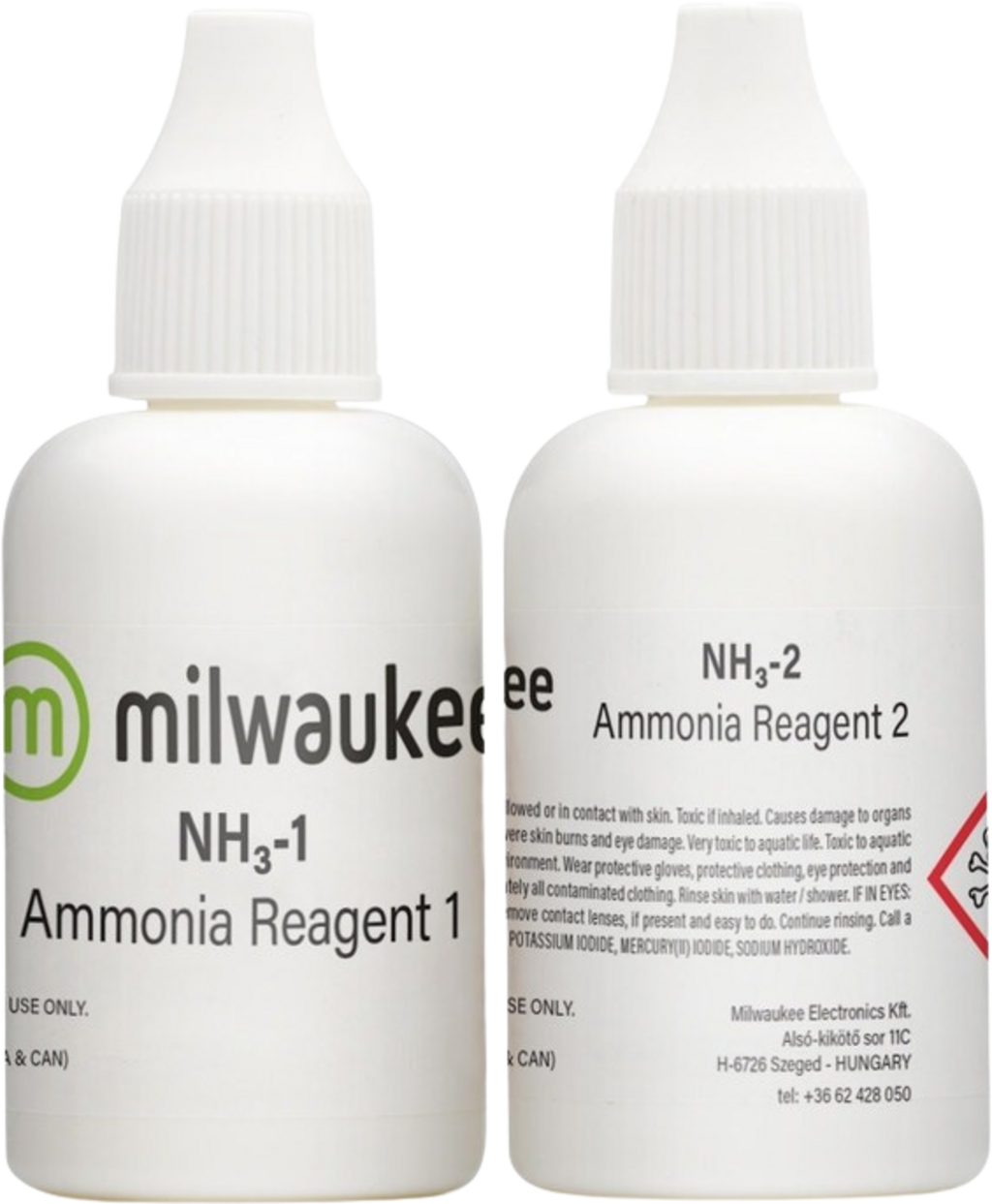 Tekoči reagent za amoniak MI505-100 je sestavljen iz visokokakovostnih reagentov za fotometer za amoniak MI405 Pro znamke Milwaukee. Tako reagent kot merilnik uporabljata prilagoditev Nesslerjeve metode. V ta namen dodajte reagent v vzorec in počakajte na reakcijo. Na podlagi barve fotometer nato določi koncentracijo amoniaka v merilnem območju 0,00–9,99 ppm (mg/l) (NH3-N).