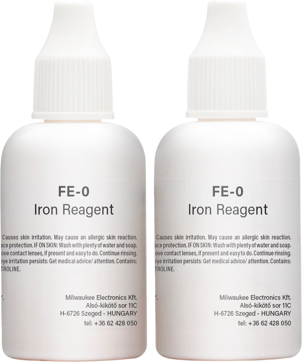 Tekoči reagent za železo MI508-100 je sestavljen iz visokokakovostnih reagentov za fotometer za železo MI408 Pro znamke Milwaukee. Tako reagent kot merilnik uporabljata prilagoditev metode USEPA 315 in standardnih metod 3500 - Fe Bmply. V ta namen dodajte reagent v vzorec in počakajte na reakcijo. Na podlagi barve fotometer nato določi koncentracijo železa v merilnem območju 0,00–5,00 ppm (mg/l) (Fe).