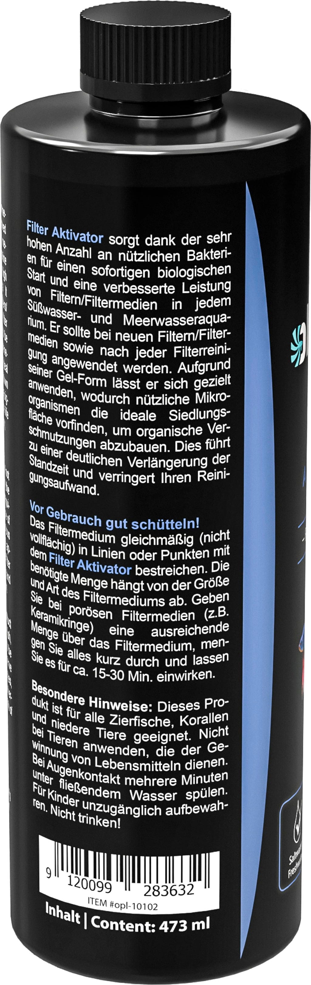 Učinkovit filter aktivator je primeren za vsak sladkovodni in slanovodni akvarij. Uporabite ga vsakič, ko namestite nove filtre ali filtrirne medije in po vsakem čiščenju filtra.