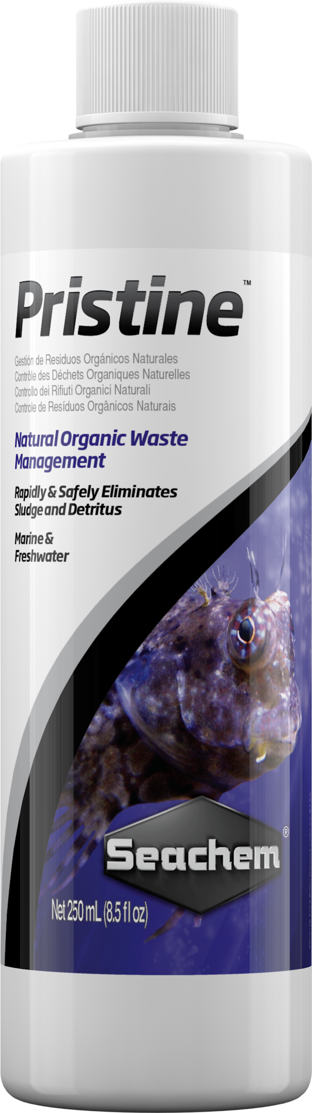 Pristine™ naravno izboljša kakovost vode v vašem akvariju z uporabo nekemične metode Bio-Augmentation. Vodi so dodane bakterije, ki razgradijo odvečno krmo, odpadke in druge ostanke. Biopolimeri, ki jih proizvajajo bakterijske kolonije, ujamejo delce in tako dolgoročno izboljšajo stanje vode. Poleg tega se zmanjšajo odvečna hranila, kot so amoniak, nitriti in nitrati.