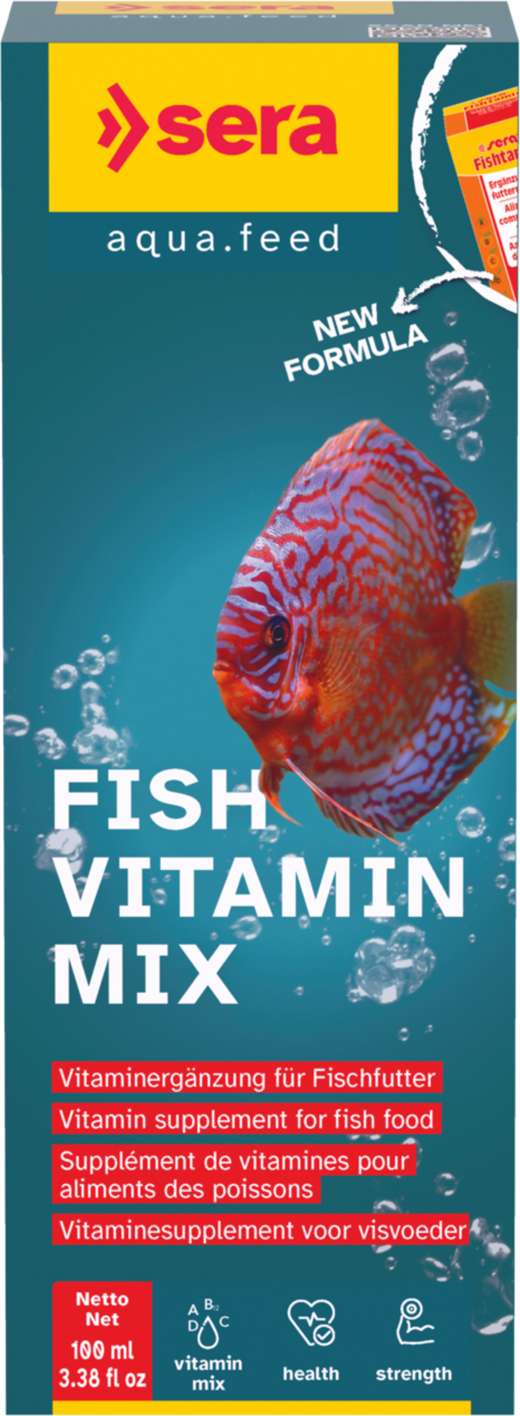 Fish Vitamin Mix znamke Sera je dopolnilna hrana iz nežno proizvedenega emulgiranega multivitaminskega koncentrata za vse ribe v sladkovodnih in slanovodnih akvarijih.