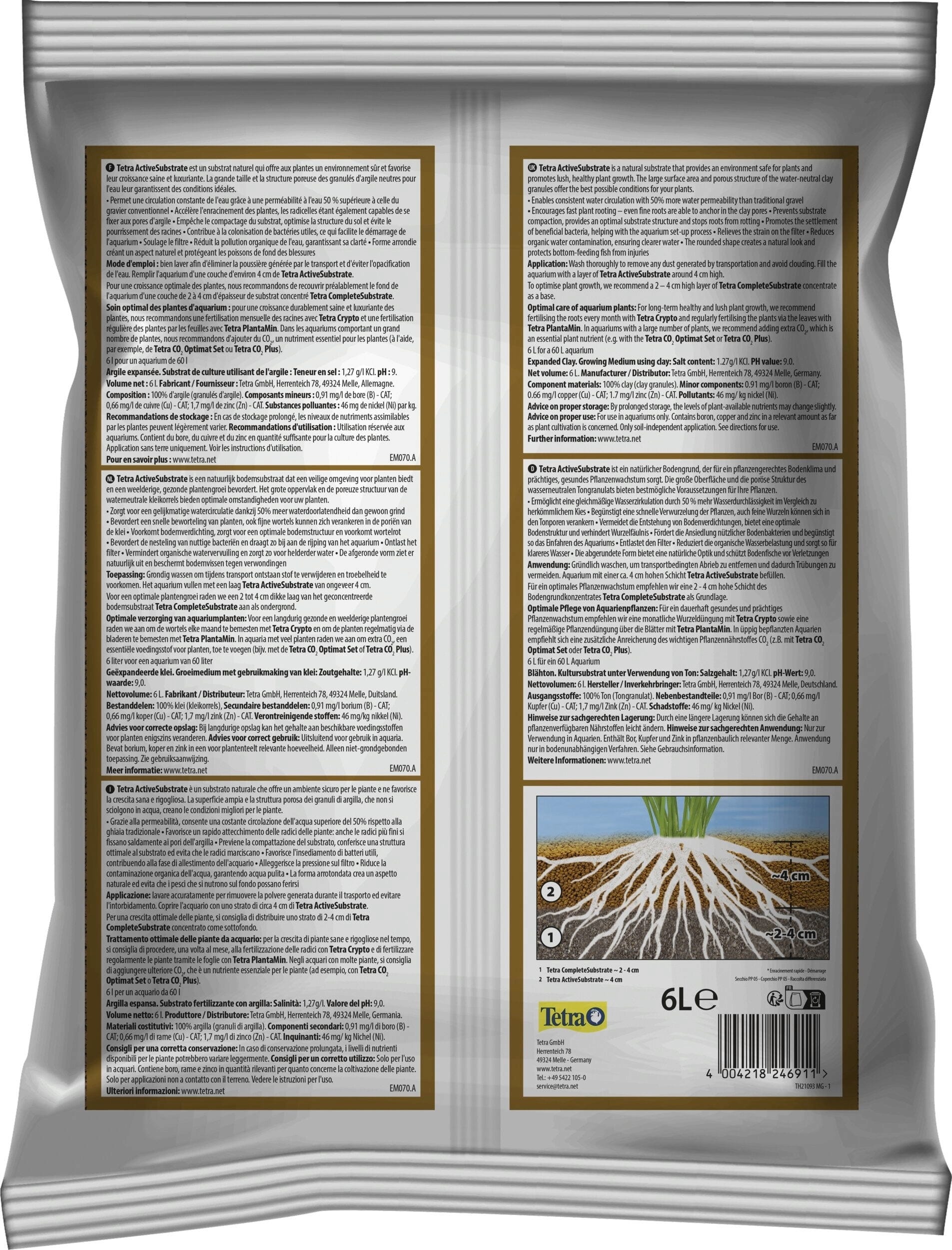 Substrat Tetra Active je naraven substrat, ki zagotavlja rastlinam prijazno klimo tal in bujno, zdravo rast rastlin. Velika površina in porozna struktura vodonevtralnih glinenih zrn ponuja številne prednosti pred običajnim gramozom. Tetra Active Substrate spodbuja naselitev koristnih bakterij v tleh in zmanjšuje organsko onesnaževanje vode. Filter je razbremenjen in zagotavlja kristalno čisto vodo, kar olajša umik akvarija. Substrat preprečuje razvoj zbitosti tal in preprečuje gnitje korenin z optimalno strukturo tal. Spodbuja se ukoreninjenje rastlin in zagotavlja trden oprijem, saj se lahko tudi drobne korenine zasidrajo v pore gline. Korenine rastlin so optimalno preskrbljene s hranili – to omogoča enakomerno kroženje vode, kar pomeni, da lahko absorbira do 50 % več hranil v primerjavi z običajnim akvarijskim prodom.