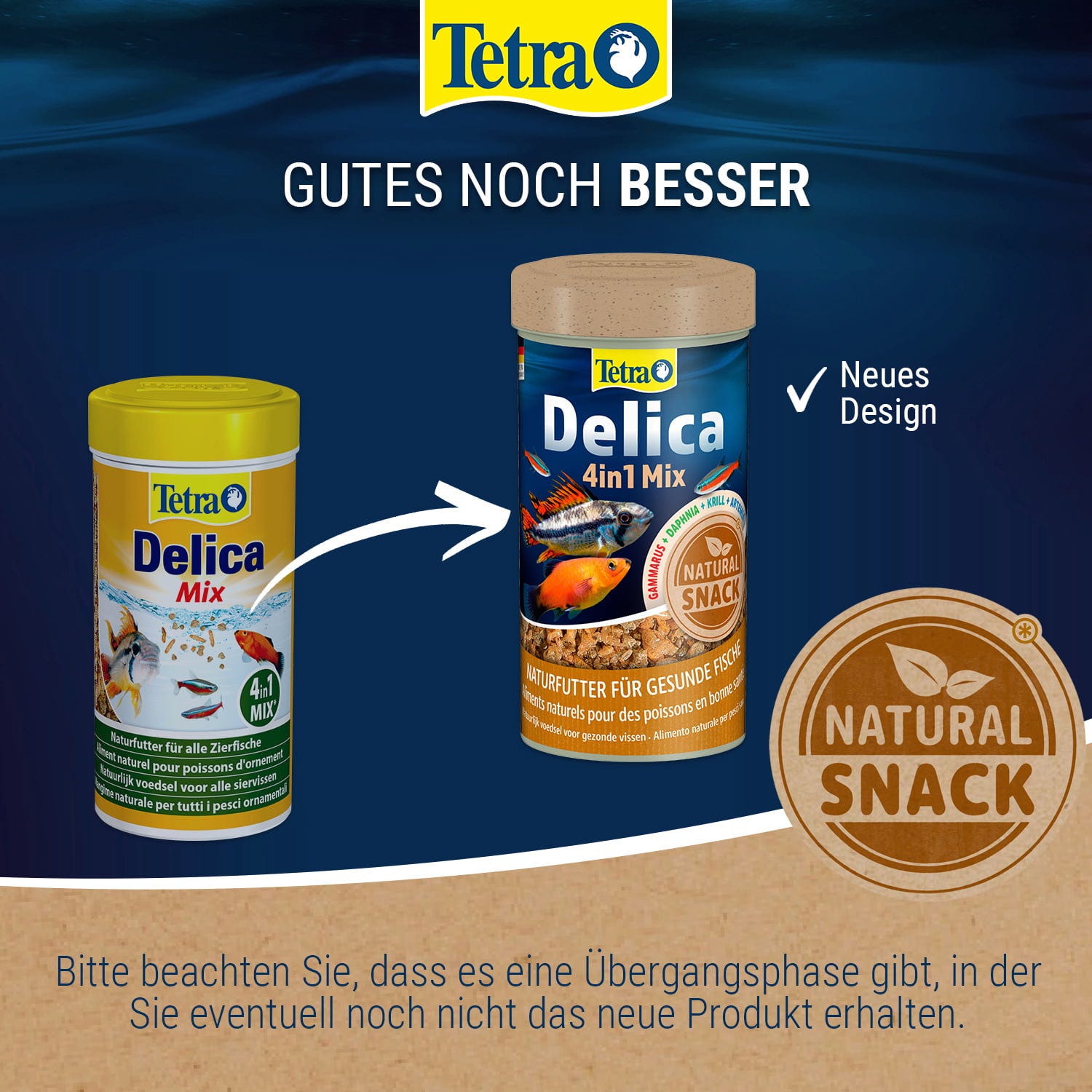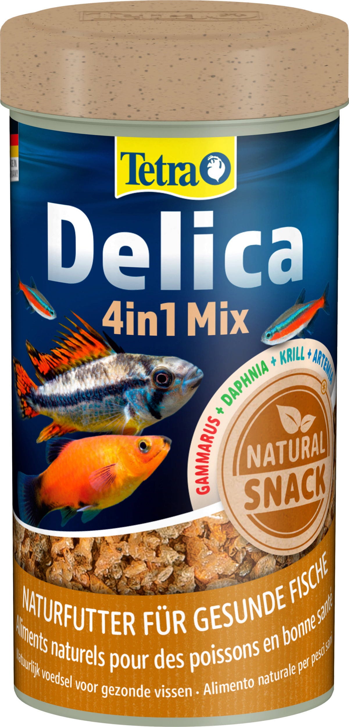 Mešanica Tetra Delica Mix je visokokakovostna dopolnilna krma v štirih ločenih razdelkih in je sestavljena iz: 29% vodne bolhe, 18% artemije, 29% krila, 24% gamarusa. Ta mešanica je popoln dodatek osnovni hrani Tetra in zagotavlja raznoliko in vrsti primerno hranjenje. Skrbno liofilizirana ali na soncu sušena naravna hrana zagotavlja optimalno hranilno vrednost in se odlikuje po kakovosti. Gammarus je naravni vir karotenoidov za izboljšanje barve rib in vsebuje približno 45 % beljakovin. Kril ima esencialne omega-3 maščobne kisline, ki zagotavljajo zdravo rast, vsebnost beljakovin je 65 %. Vodne bolhe so idealen vir naravnih balastnih snovi za pospeševanje prebave, poleg tega pa tudi visok delež mineralov, vsebnost beljakovin je okoli 35 %. Artemia ima visoko vsebnost hranilnih snovi in karotenoidov, ki naravno poudarijo barve rib, in vsebuje približno 45 % beljakovin.