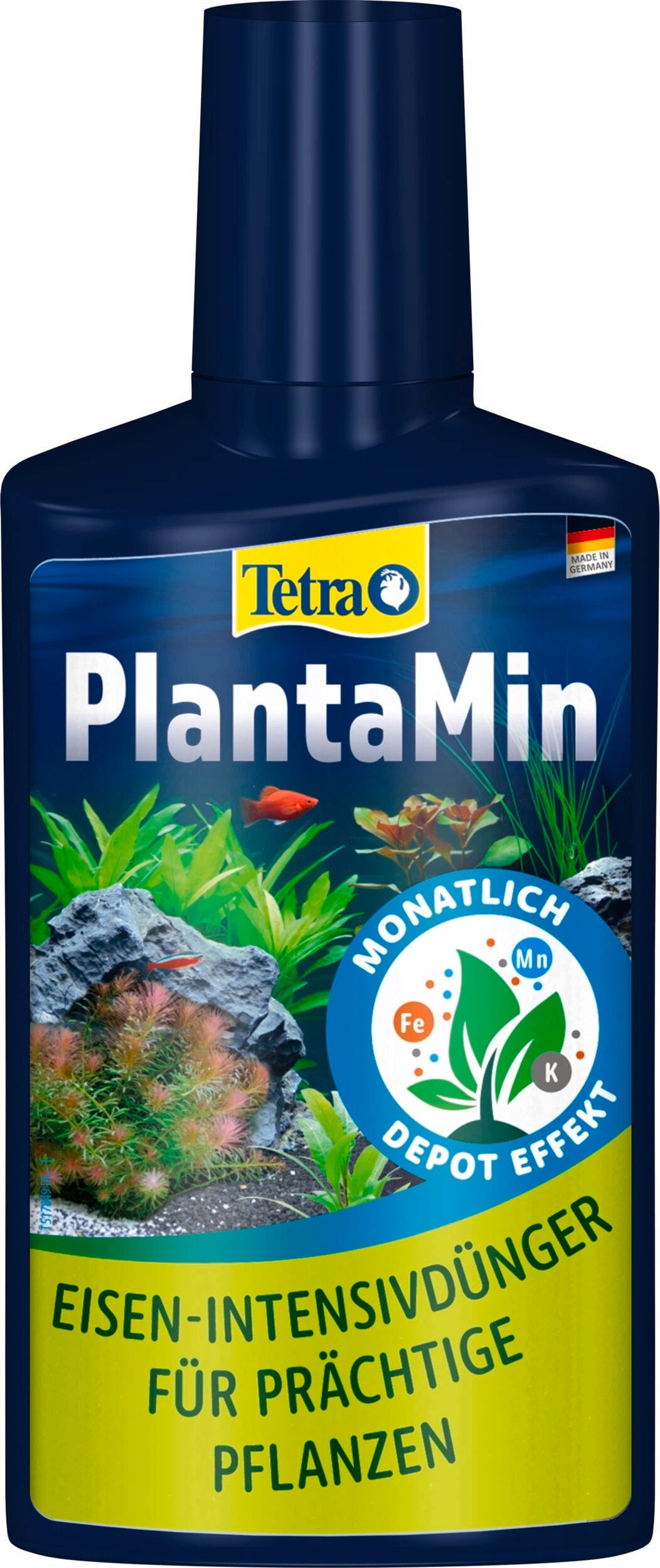 Zahvaljujoč posebni depo formuli so hranila, ki jih vsebuje Tetra PlantaMin, rastlinam na voljo v obdobju 4 tednov. Železo, kalij, mangan in drugi bistveni elementi v sledovih zagotavljajo bujno in zdravo rast rastlin. Močne in zdrave rastline so najboljša profilaksa proti algam. PlantaMin omogoča absorpcijo hranil skozi liste in ne onesnažuje akvarijske vode, saj je brez nitratov in fosfatov.