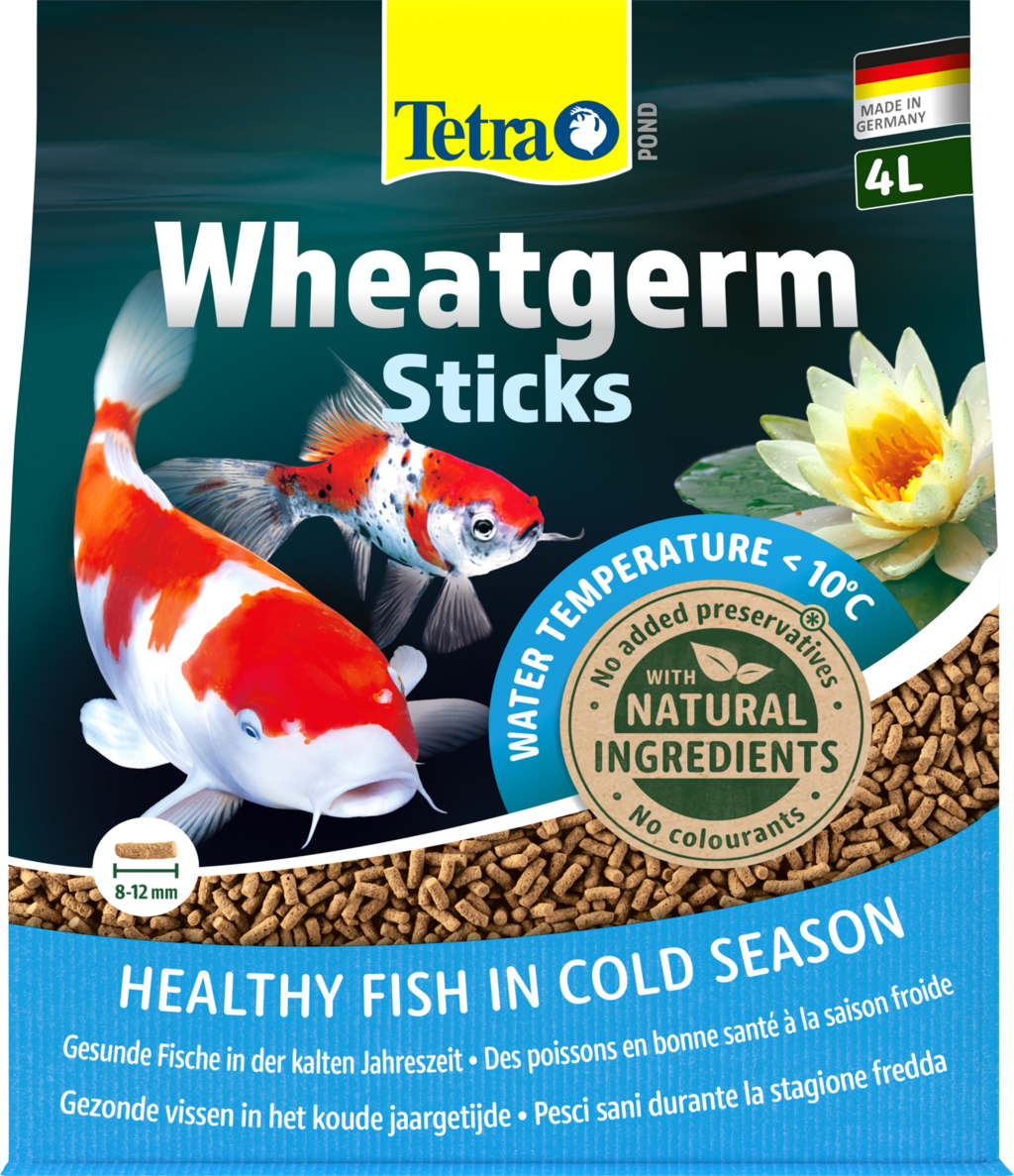 S Tetra Pond Wheatgerm Sticks je Tetra razvila visokokakovostno osnovno hrano za vse zahtevne ribe v vrtnem ribniku, predvsem za jesensko in spomladansko sezono, ki se lahko hrani pri temperaturah pod 10° C in zadosti ribjim potrebam po zdravi in pestri prehrani. Krma vsebuje vsa bistvena hranila, vitamine in elemente v sledovih. Palčke so bogate s prehranskimi vlakninami in so, zato optimalno prilagojene zmanjšani presnovni aktivnosti v hladnejših mesecih leta. Tetra Pond Wheatgerm Sticks odlično kondicionira za prezimovanje in zagotavlja hitro krepitev po njem. Preprosto prebavljivost zagotavljajo visokokakovostne palčke pšeničnih kalčkov, bogate z vlakninami. Enostavna absorpcija in dobra prebavljivost palčk zagotavljata nizko onesnaženost in izboljšano kakovost vode. Visokokakovostna vrečka iz folije, ki jo je mogoče ponovno zapreti, ščiti krmo pred škodljivimi vplivi, kot so sončna svetloba, zrak in vlaga. To ščiti najpomembnejše sestavine in ohranja svežino krme, tako da so vaše ribe deležne najboljše možne nege.