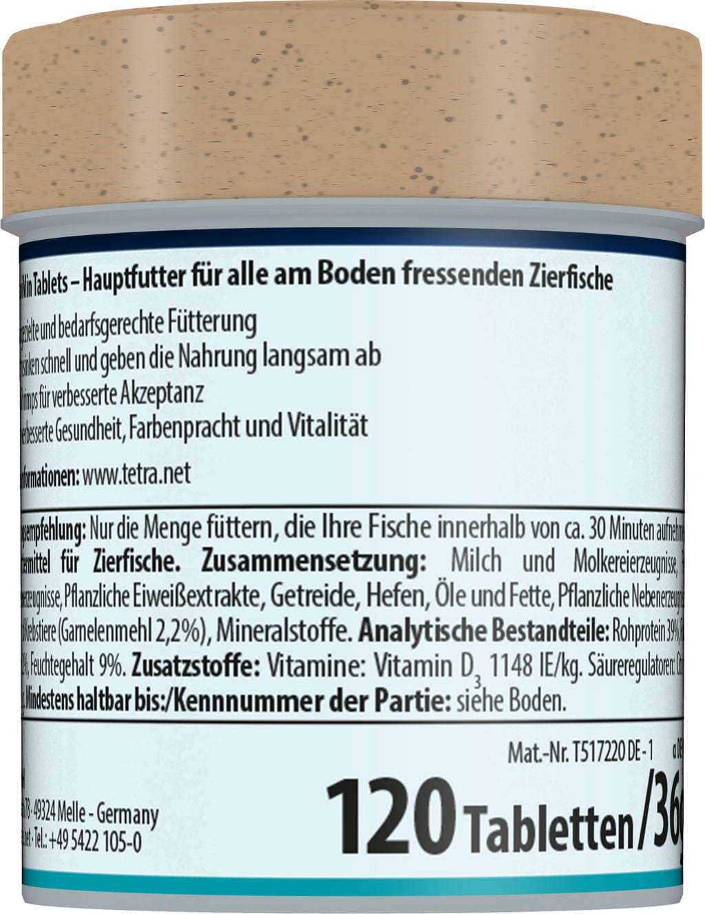 Tetra Tablets TabiMin je vrhunska, biološko uravnotežena hrana v tabletah, bogata s hranili, za vse ribe, ki se hranijo na dnu. Tablete hitro potonejo, jih je enostavno namestiti na skrita mesta za sramežljive ribe in se počasi raztopijo za enostavno hranjenje, ne da bi poškodovale ali zameglile vodo. Nova formula za več tablet vsebuje kozice za boljše sprejemanje ter vsa bistvena hranila, vitamine in minerale. Morske alge s številnimi naravnimi minerali in karotenoidi prispevajo k naravni okrepitvi barvitosti. Krma Tetra je lahko prebavljiva, zato je voda manj onesnažena ter ostaja čista in bistra.