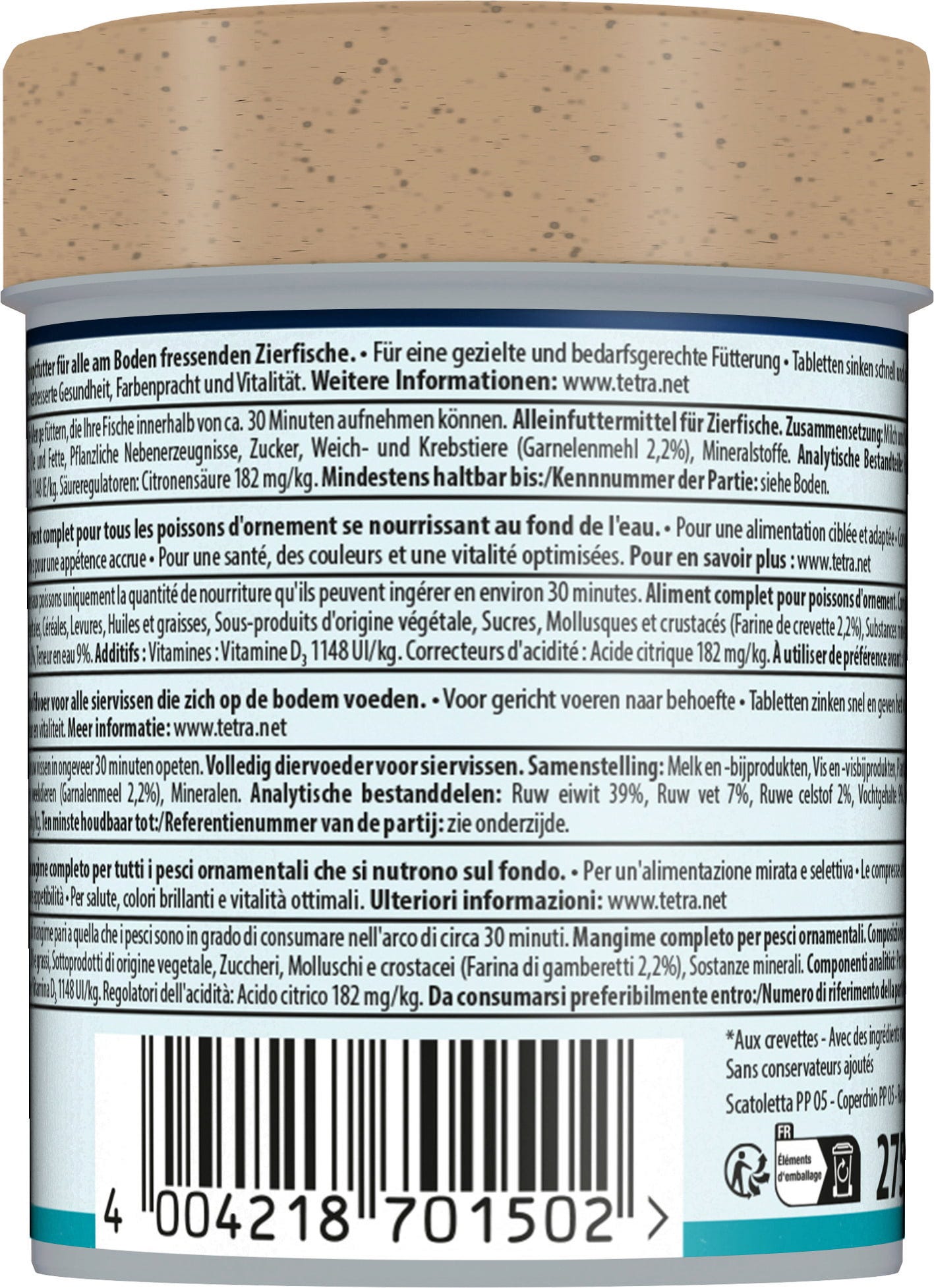 Tetra Tablets TabiMin je vrhunska, biološko uravnotežena hrana v tabletah, bogata s hranili, za vse ribe, ki se hranijo na dnu. Tablete hitro potonejo, jih je enostavno namestiti na skrita mesta za sramežljive ribe in se počasi raztopijo za enostavno hranjenje, ne da bi poškodovale ali zameglile vodo. Nova formula za več tablet vsebuje kozice za boljše sprejemanje ter vsa bistvena hranila, vitamine in minerale. Morske alge s številnimi naravnimi minerali in karotenoidi prispevajo k naravni okrepitvi barvitosti. Krma Tetra je lahko prebavljiva, zato je voda manj onesnažena ter ostaja čista in bistra.